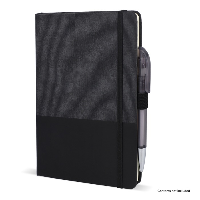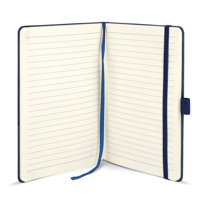 A5-notitieboek van thermo PU-leer met een moderne, premium uitstraling. Voorzien van een elastische sluiting, lintmarker en pennenlus. Het bevat 80 gelinieerde crèmekleurige pagina’s van FSC-gecertificeerd papier.