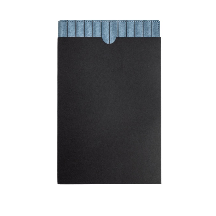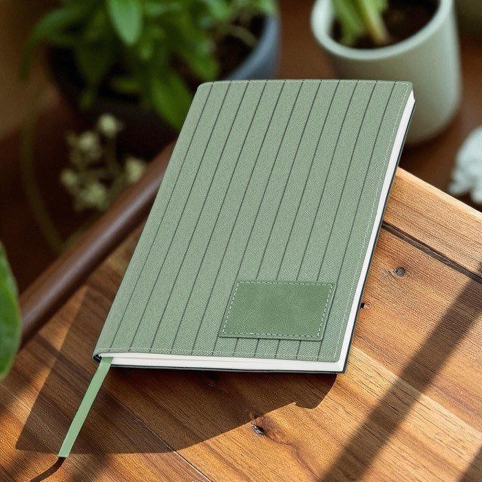 A5-blocnote met PU-cover met textuur en een personaliseerbaar label. Bevat blanco vellen papier afkomstig uit verantwoord beheerde bossen en wordt geleverd in een zwart kartonnen hoes. Geïnspireerd op de Set, met een levendig kleurenpalet en een geoptimaliseerd aantal bladzijden.