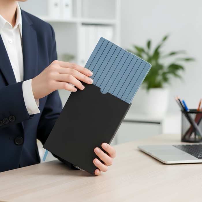 Leg je beste ideeën vast terwijl je logo de aandacht trekt met dit notitieblok met textuurcover. Beschikbaar in levendige kleuren met blanco pagina’s.