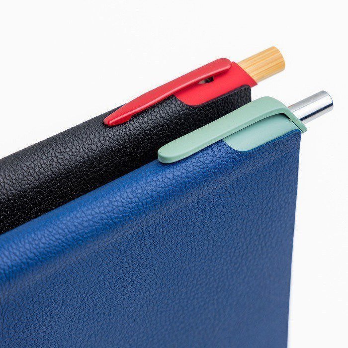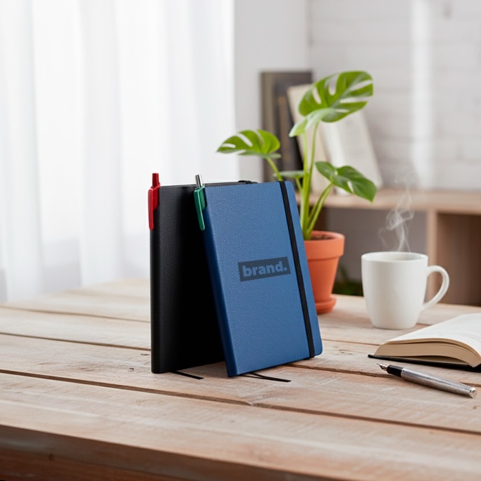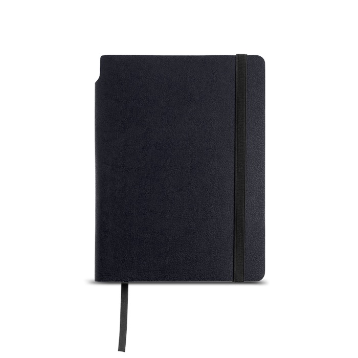 A5-blok met flexibele kaft van gerecycled kunstleer en afgeronde hoeken. Gemaakt voor dagelijks gebruik op kantoor of onderweg. Het heeft 160 blanco pagina’s van wit 80 g papier met certificaat voor duurzaam bosbeheer, voor traceerbaarheid van de herkomst van het papier. De elastische sluiting helpt het beschermd te houden in je rugzak of aktetas. Inclusief lintmarker en een handige penhouder. Een praktische keuze voor interne trainingen, klantafspraken of bedrijfsevenementen met personalisatie.