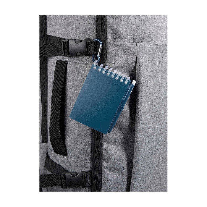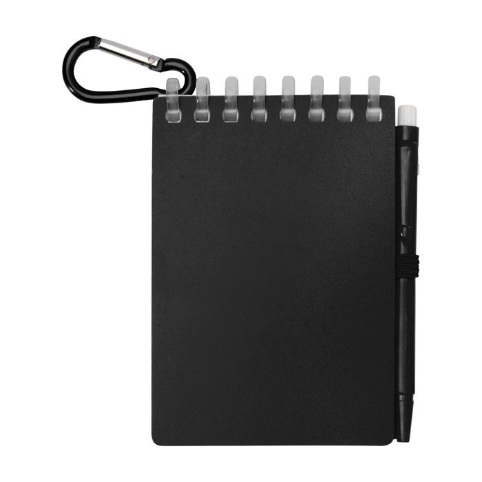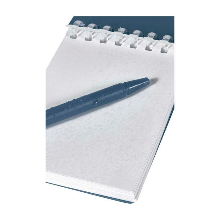 Set van notitieboekje en pen van gerecycled plastic, bedoeld om aantekeningen te maken buiten kantoor. Het notitieboekje met spiraalbinding heeft 70 blanco vellen watervast steenpapier van 120g/m², met afgeronde hoeken en een geïntegreerde houder zodat je de pen altijd bij de hand heeft. De bijpassende pen, gemaakt van plastic, schrijft met zwarte inkt en heeft een geschatte schrijflengte van 250 meter. De metalen ring maakt het makkelijk om het aan een rugzak of sleutelbos te hangen voor mobiele marketingacties.