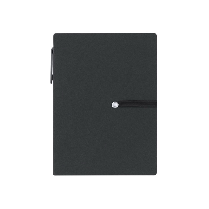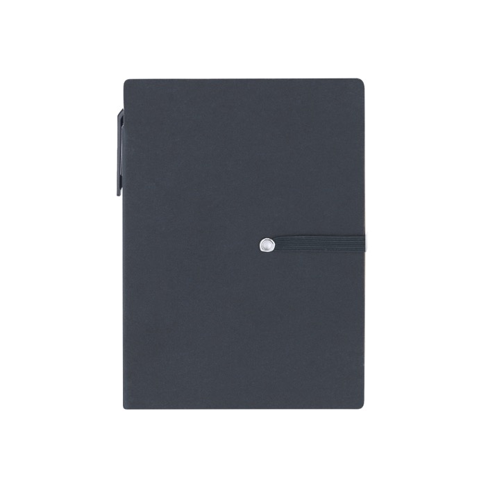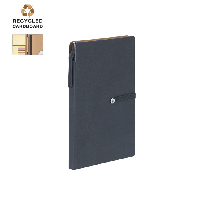 A6-blok van gerecycled karton met harde kaft en sluiting met een bijpassend elastiek. Inclusief een blok met 70 witte vellen met lijntjes om je dagelijkse notities netjes te ordenen. Aan de binnenkant van de kaft zitten gele sticky notes in twee formaten en 100 mini sticky notes in verschillende kleuren om taken te markeren, prioriteiten te bepalen en snelle herinneringen achter te laten. Compleet met een pen met blauwe inkt en drukmechanisme. Aanbevolen voor trainingen, evenementen en kantoormateriaal met logo.