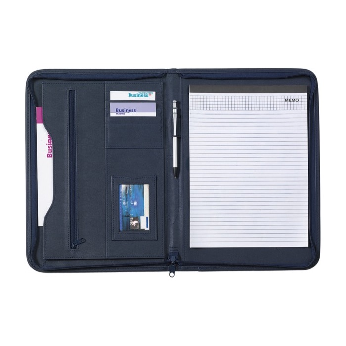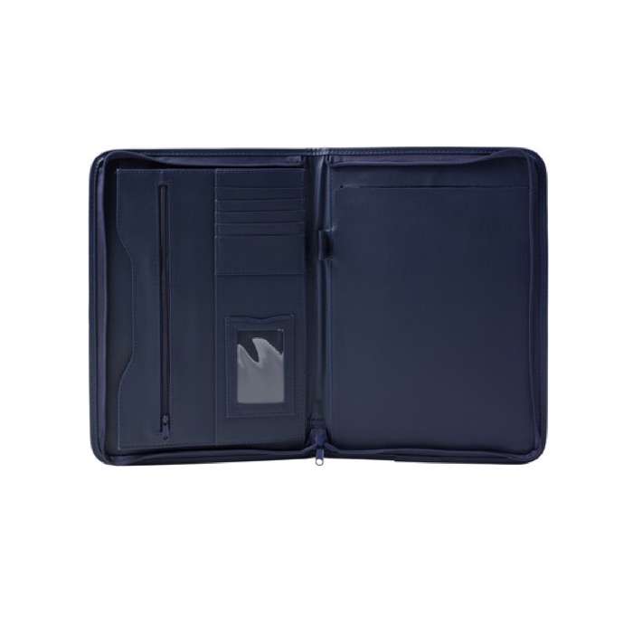 PU documentenmap (A4), met ritssluiting en diverse insteekvakken, excl. schrijfblok en pen.