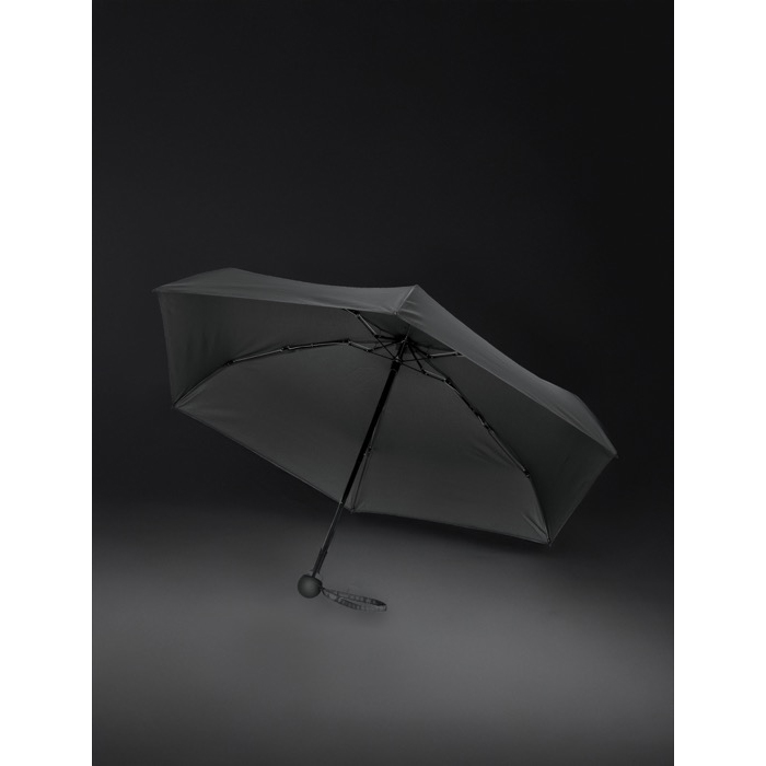 Deze Aware™ RPET super mini handmatige paraplu heeft vijf secties, waardoor hij ultracompact kan worden terwijl hij toch volledige dekking biedt. Dankzij het slanke formaat past hij gemakkelijk in de meeste tassen of broekzakken. Gemaakt van 100% rPET 190T pongee met AWARE™ tracer, wat het echte gebruik van gerecyclede materialen garandeert. De stalen schacht en het frame, gecombineerd met 8 glasvezelribben in een tweesectieontwerp, zorgen voor duurzaamheid en windbestendigheid. De paraplu heeft een handmatig open- en sluitsysteem en een PP-handvat met een PU-coating voor een comfortabele grip. Hij is voorzien van een digitaal productpaspoort, is PVC-vrij en wordt individueel verpakt in een polybag.