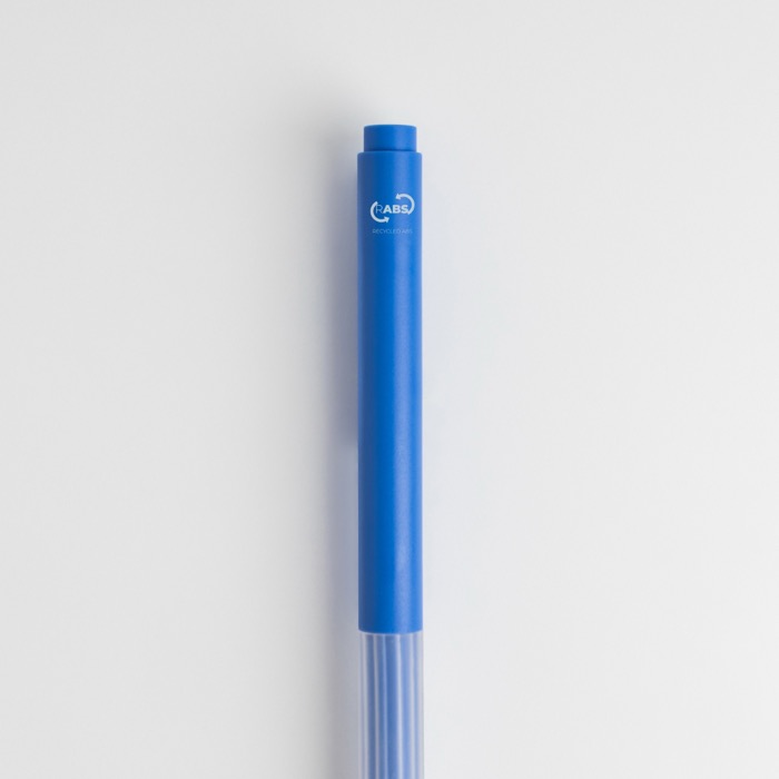 Pen van gerecycled ABS met een solide gekleurd lichaam en componenten. Voorzien van een transparante siliconen grip voor meer comfort, zwarte gelinkt en een geruisloos drukmechanisme. Perfect voor werk of studie.