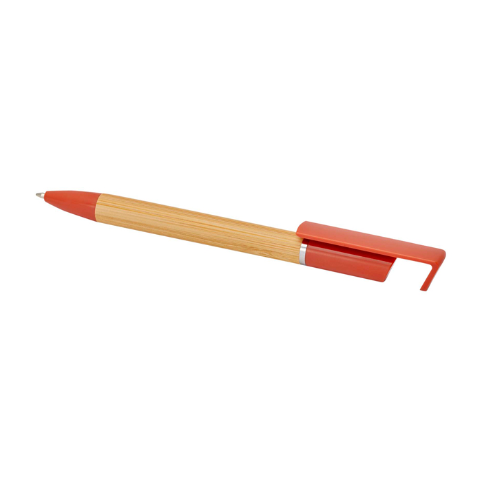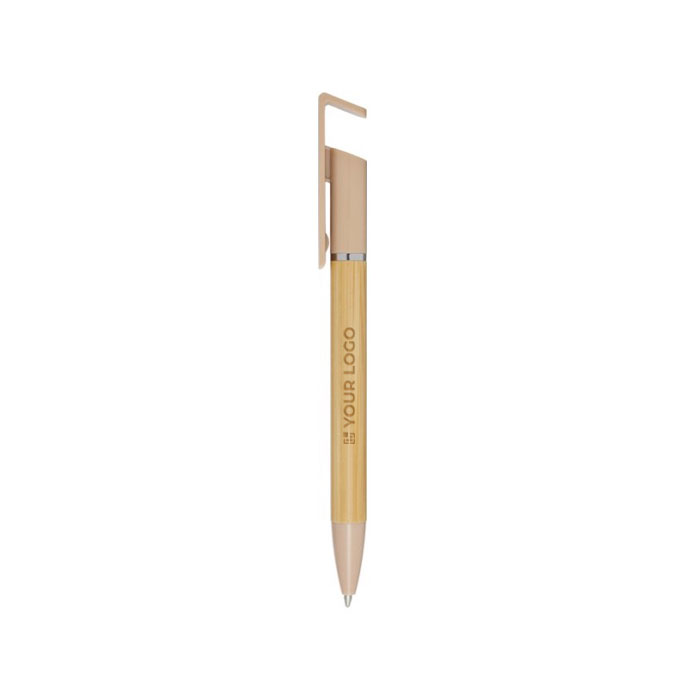 Bamboe pen met telefoonhouder. Combineert stijl en functionaliteit in één accessoire. Een creatieve promotie touch voor elk evenement.