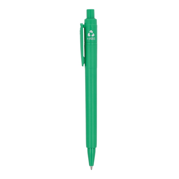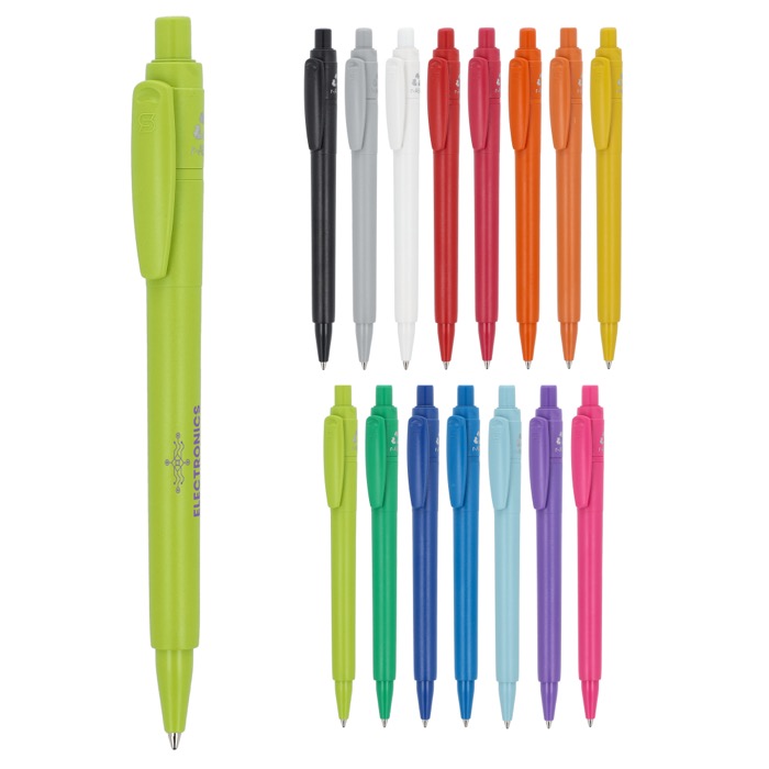 Balpen van gerecycled plastic, gemaakt in Italië, Europa. Bedoeld voor dagelijks gebruik op kantoor, bij de receptie of tijdens zakelijke bezoeken. De blauwe inkt schrijft strak, zodat je snel notities maakt, tekent of formulieren invult. De lichte behuizing neem je makkelijk mee in je zak, map of corporate lanyard zonder extra volume. Het oppervlak is geschikt om te bedrukken met je logo en zo je merk langdurig zichtbaar te houden. Handig voor beurzen, interne trainingen en wervingsacties op het verkooppunt.