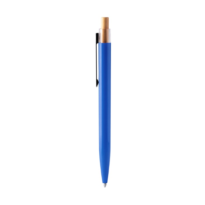 Gekleurde balpen van gerecycled plastic, bedoeld voor dagelijks gebruik op kantoor en bij evenementen. Met een bamboe drukknop, transparante details zodat je het mechanisme makkelijk herkent en een metalen clip om hem aan een map, notitieboek of broekzak te bevestigen. Schrijft soepel dankzij de blauwe inkt, geschikt voor handtekeningen en snelle notities. Door het sobere design en de mix van materialen past hij goed bij interne communicatie, beurzen of als praktisch detail voor bezoeken en afspraken.