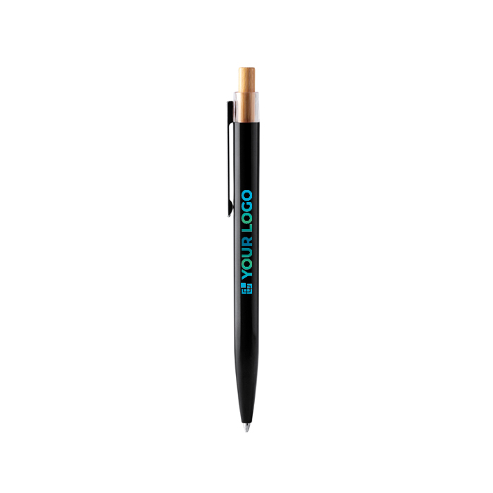 Balpen met metalen clip en bamboe drukknop, blauwe inkt