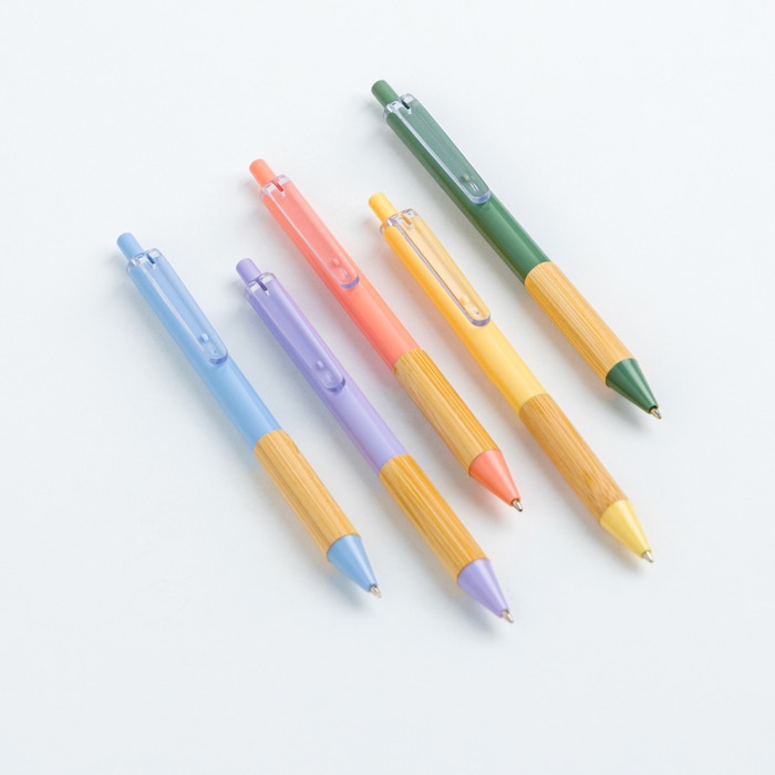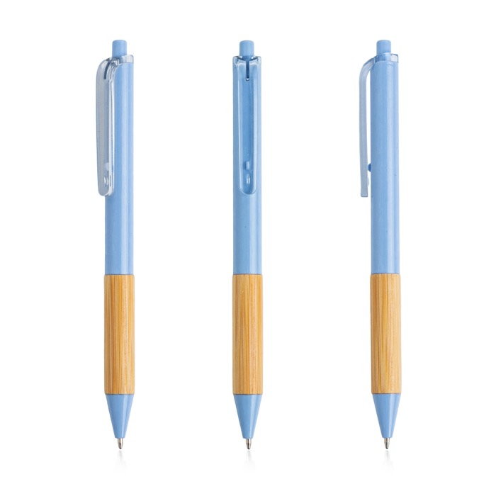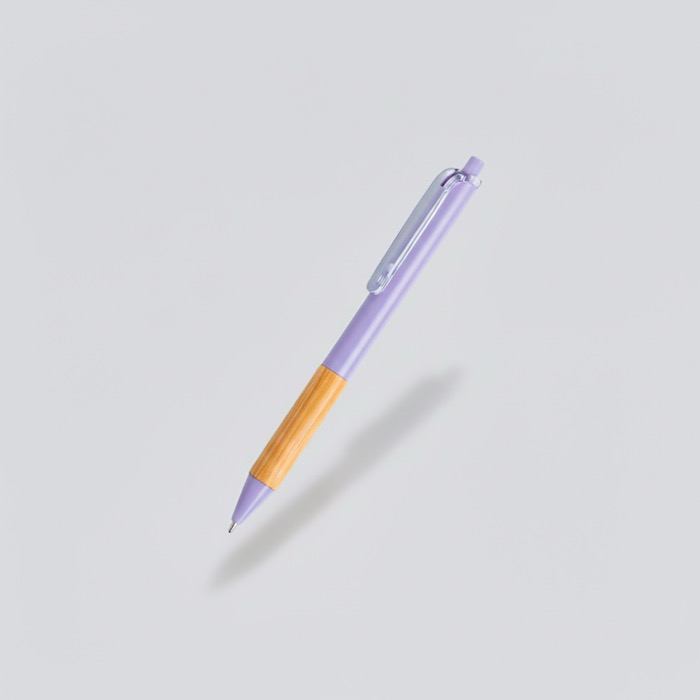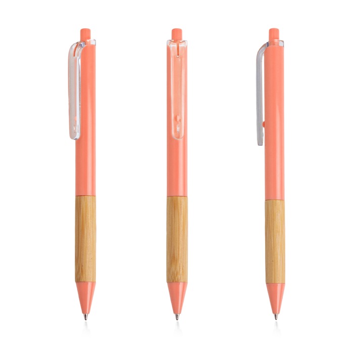 Balpen van gerecycled plastic met transparante clip en een gripzone van bamboe, bedoeld voor dagelijks gebruik op kantoor. Met het drukmechanisme schrijf je snel en trek je de punt net zo vlot weer in. De zwarte inkt zorgt voor heldere, consistente notities. De lichte constructie maakt hem makkelijk om mee te nemen en in grote aantallen uit te delen, terwijl hij lang stevig blijft. Verkrijgbaar in meerdere kleuren, zodat je hem kunt afstemmen op campagnes of afdelingen. Aanbevolen als ondersteunend item voor beurzen, interne trainingen en brandingacties met logo.