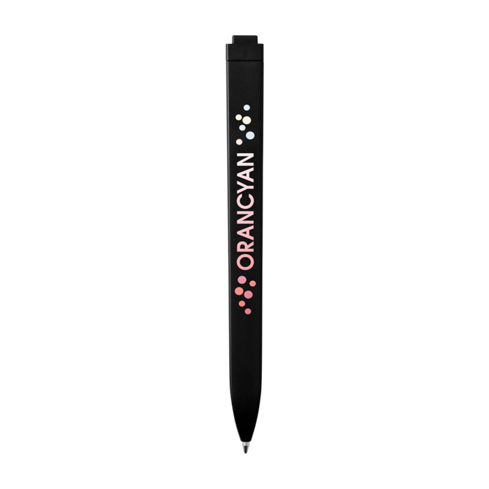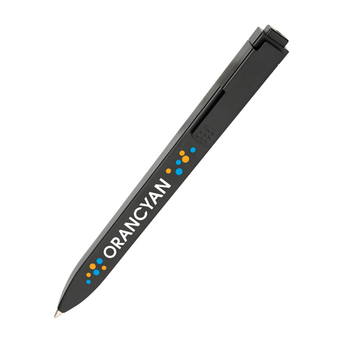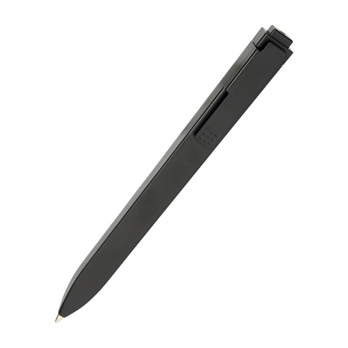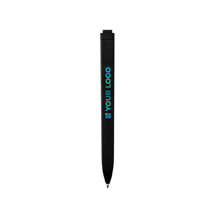 Zwarte plastic pen, ontworpen om aan de zijkant van notitieboeken met harde kaft te klikken zodat je hem altijd bij de hand hebt. De rechthoekige behuizing geeft extra grip en helpt je gecontroleerd te schrijven tijdens meetings of onderweg. De intrekbare punt van 1 mm beschermt de vulling wanneer je hem niet gebruikt en voorkomt vlekken in tassen of etuis. Zwarte inkt voor scherpe, constante lijnen. Gemaakt in Europa: een praktische keuze voor merkacties op kantoor en events.