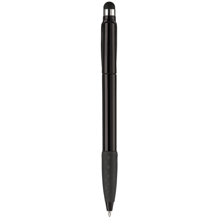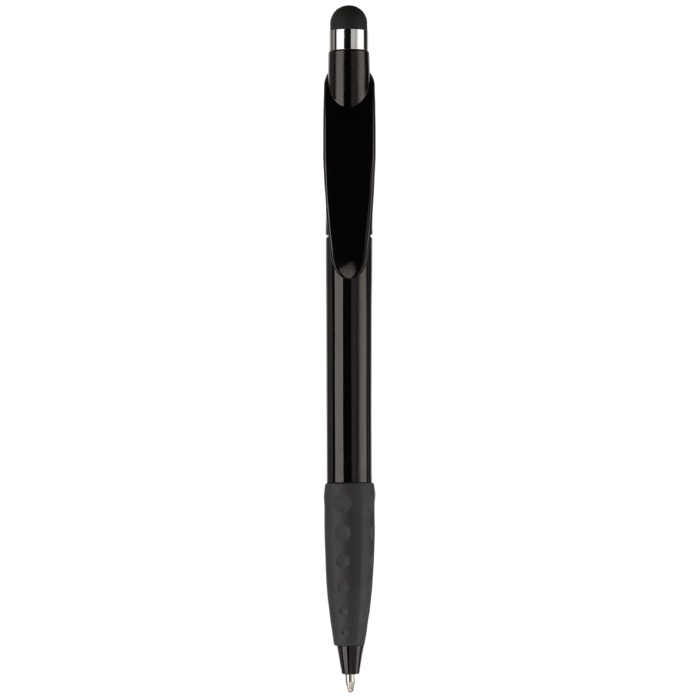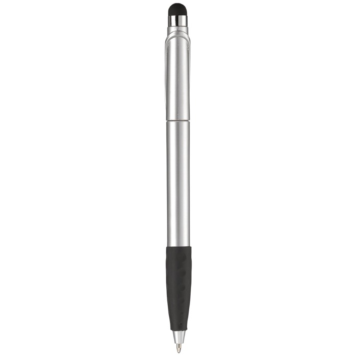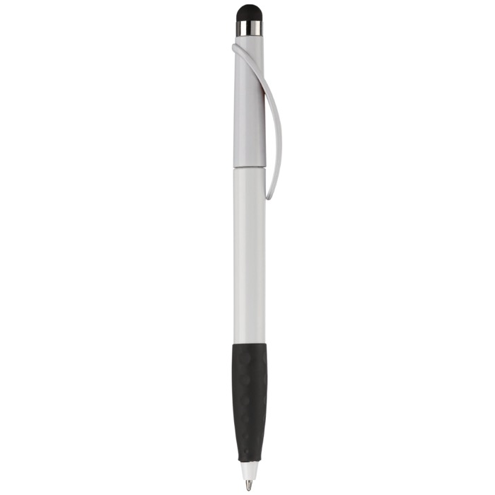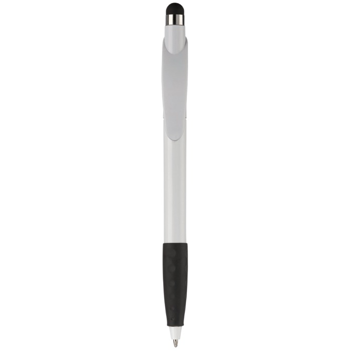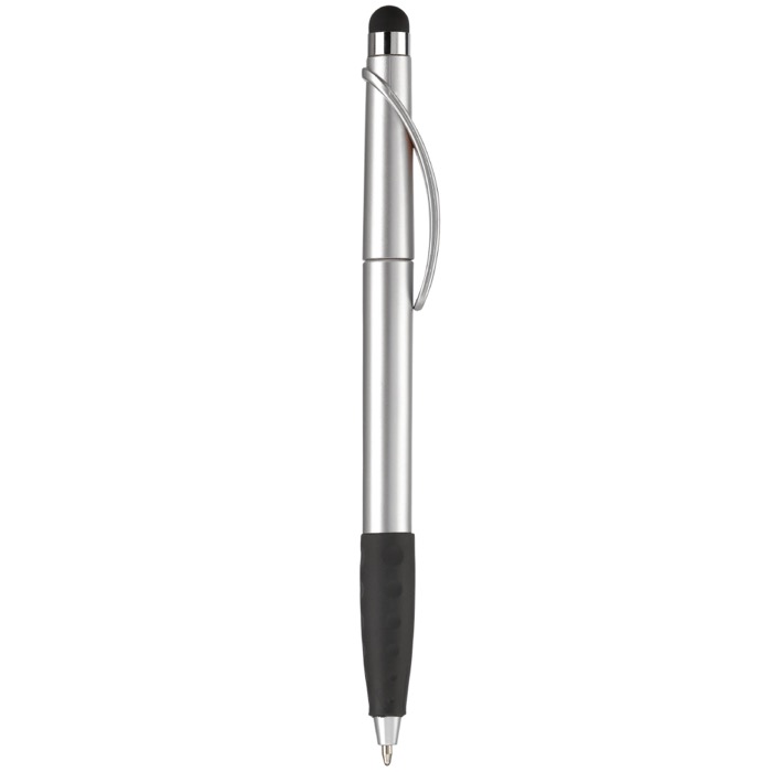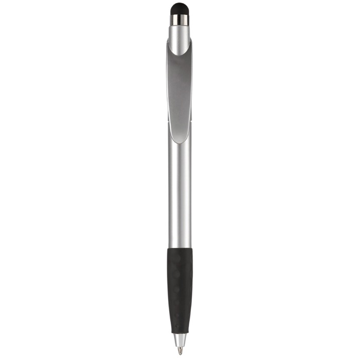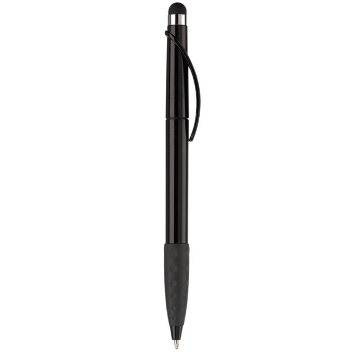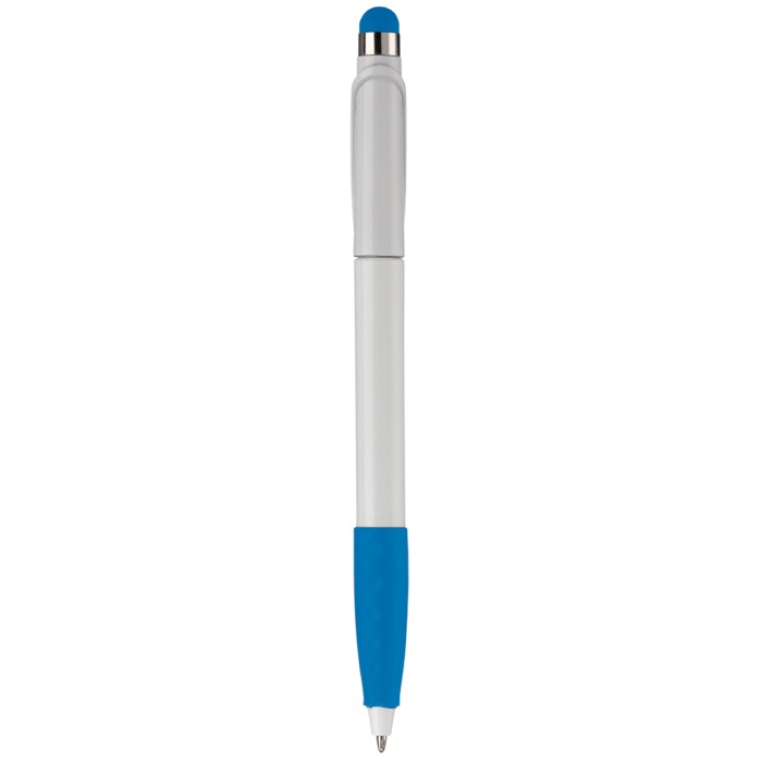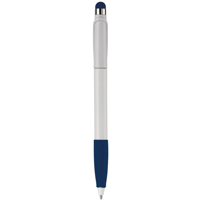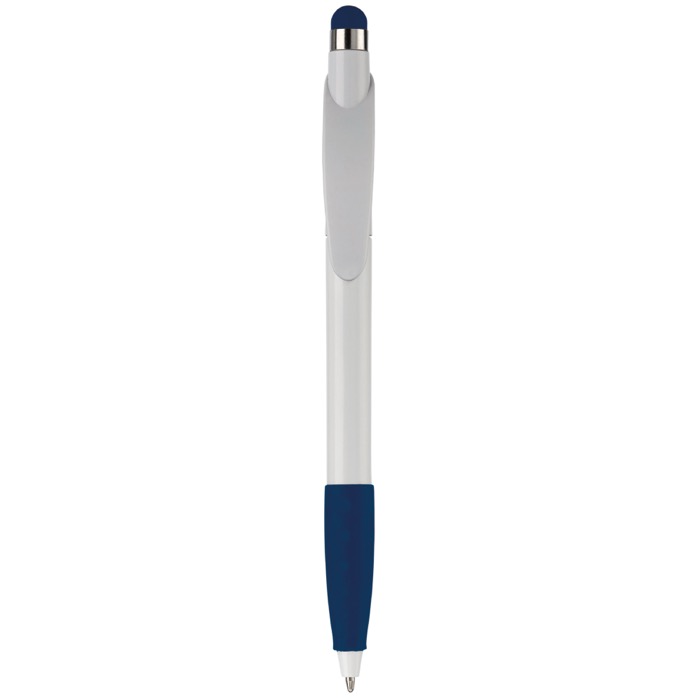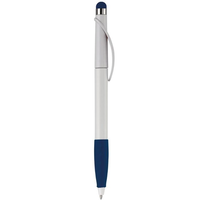 Pen met gebogen clip, rubberen grip en stylus voor touchscreen. Draaimechanisme. Schrijfkleur blauw.