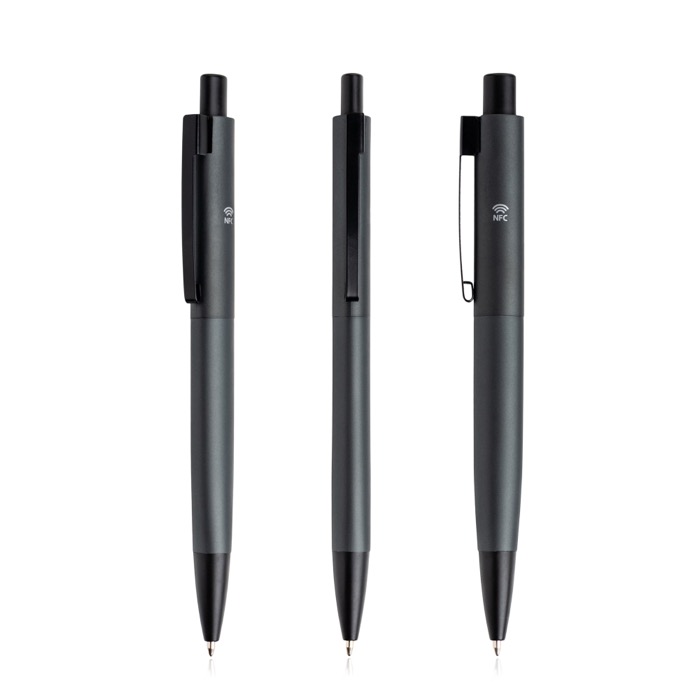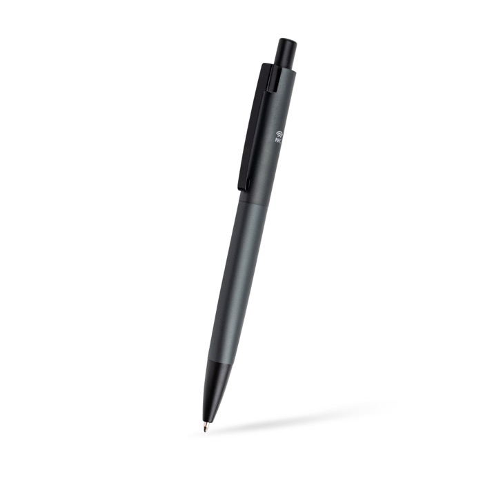 Aluminium pen met zilverkleurige details, elegant en modern van design. Voorzien van een drukmechanisme en blauwe inkt. Geschikt voor personalisatie via lasergravure, wat naadloos aansluit bij de metalen afwerking.