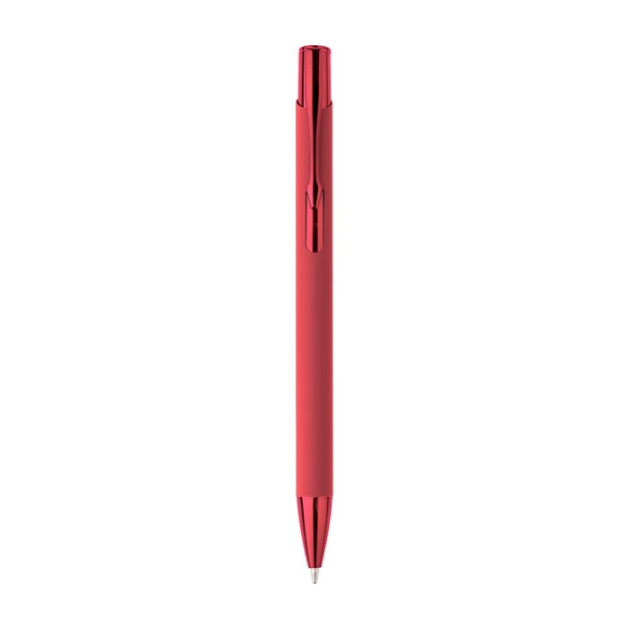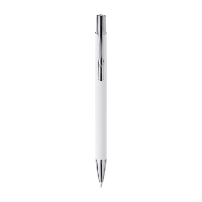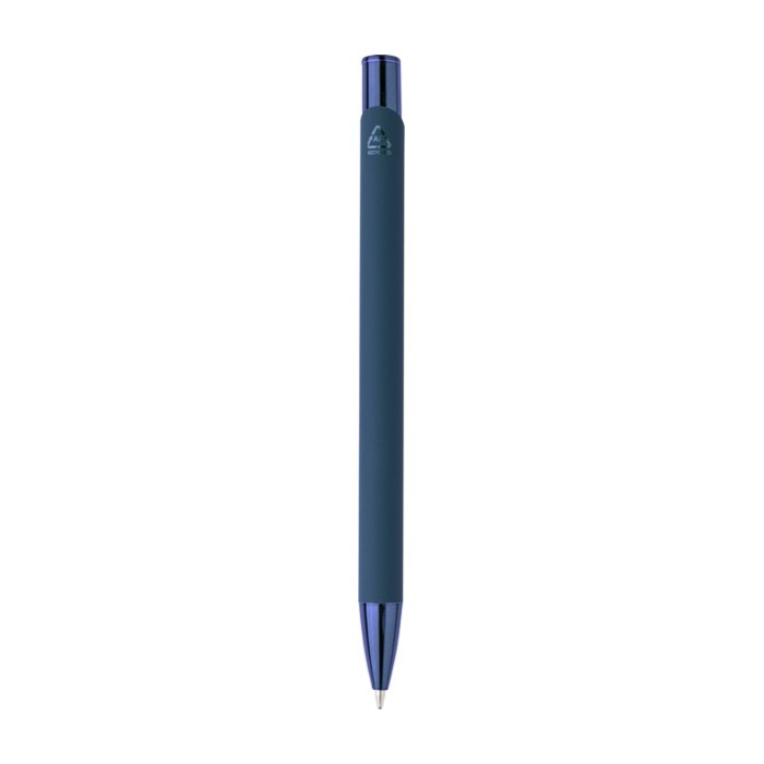Balpen van gerecycled aluminium en rubber met een kunststof drukknop, glanzende UV-afwerking, chromen punt en een metalen clip met bijpassende UV-coating. De lasergravure geeft je logo een glanzend spiegeleffect. Zo valt je merk dagelijks op. Schrijft ongeveer 800 meter met blauwe inkt en wordt geleverd in een individuele plastic verpakking. Een praktische keuze voor marketingacties, beurzen en kantoorartikelen voor bedrijven.