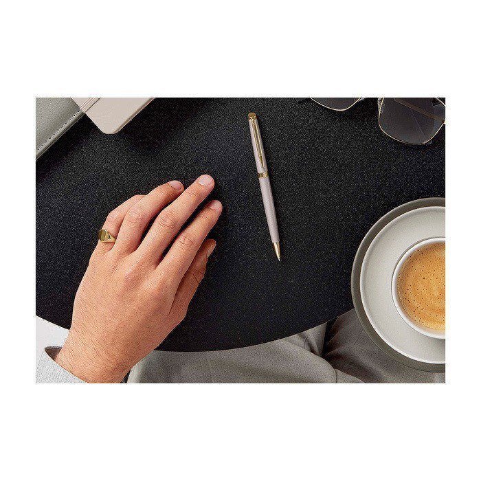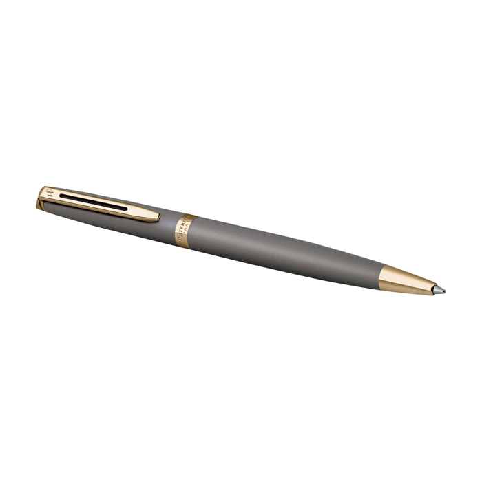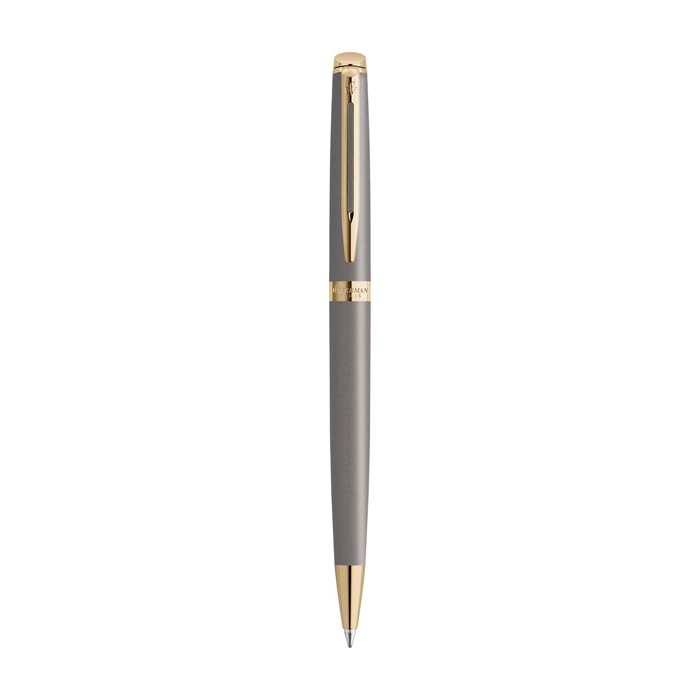 Balpen met gelakt lichaam en gelakte dop met gemetalliseerde afwerking. Ontworpen voor zorgvuldig en consequent dagelijks schrijven. Het ontwerp heeft een lichtgouden sierlijst en een dubbel vertakte clip met het Waterman-zegel. De uitstraling is neutraal en tijdloos. Past goed in zakelijke omgevingen. De punt met sneldrogende inkt geeft een vloeiende en strakke lijn in blauw. Gemaakt in Frankrijk en geleverd in een geschenkdoos van het merk, met internationale garantie van twee jaar. Aanbevolen voor relatiegeschenken, events en loyaliteitsacties met een premium uitstraling.