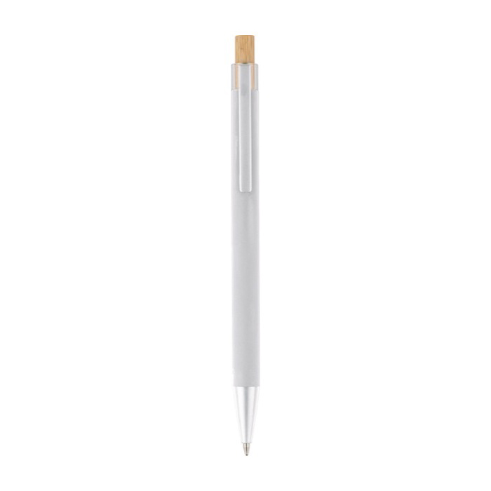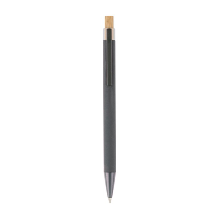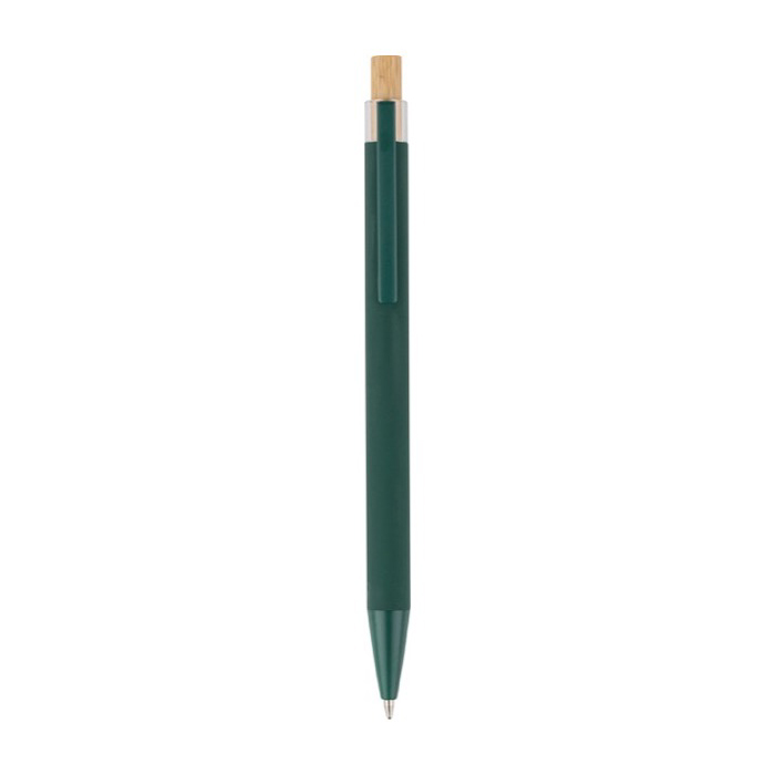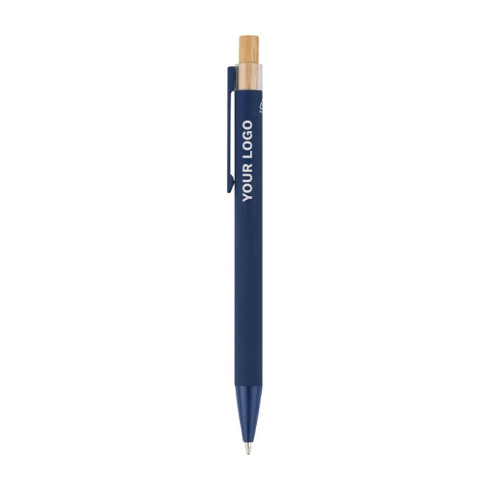 Gerecyclede aluminium pen met een drukknop van bamboe en kunststof details (AS, acrylonitril styreen). Met metalen clip en bijpassende kunststof punt voor comfortabel gebruik op kantoor en bij zakelijke bezoeken. Het logo wordt met laser in de houder gegraveerd, voor een scherpe en duurzame bedrukking. Biedt een bereik van ongeveer 800 meter schrijven met blauwe inkt, bedoeld voor dagelijks gebruik. Handig voor acquisitieacties en beurzen.