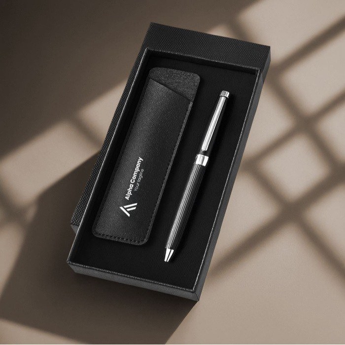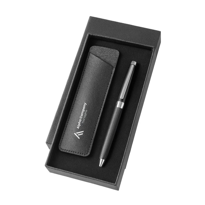 Elegant schrijfsset met metalen draaibare pen, blauwe inkt en bijpassend PU-etui. Geleverd in geschenkdoos.