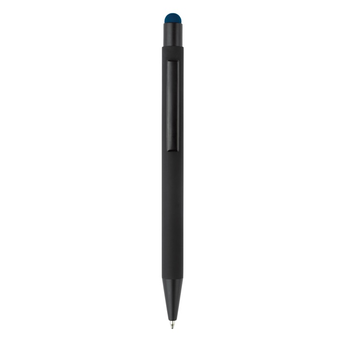 Elegante metalen balpen met zwarte delen en gekleurde styluspunt. De balpen kan voorzien worden van een lasergravure en het logo zal in de kleur van de styluspunt uitkomen. Blauwschrijvende vulling.