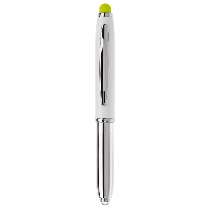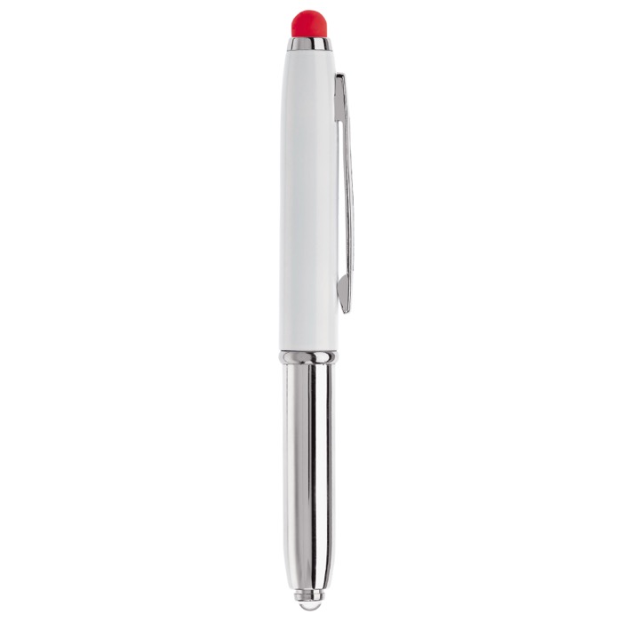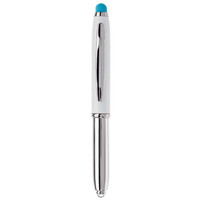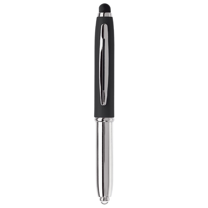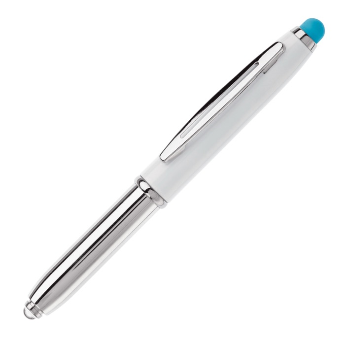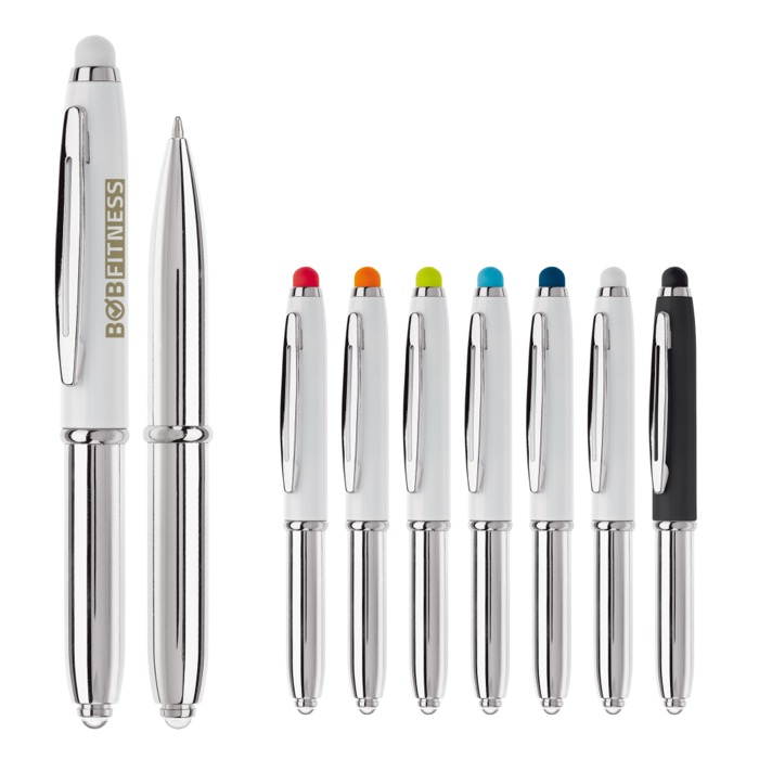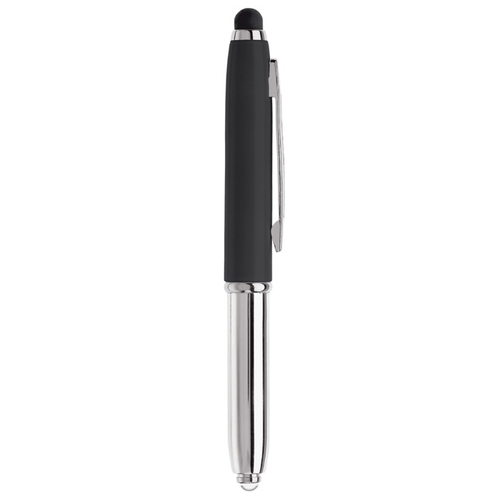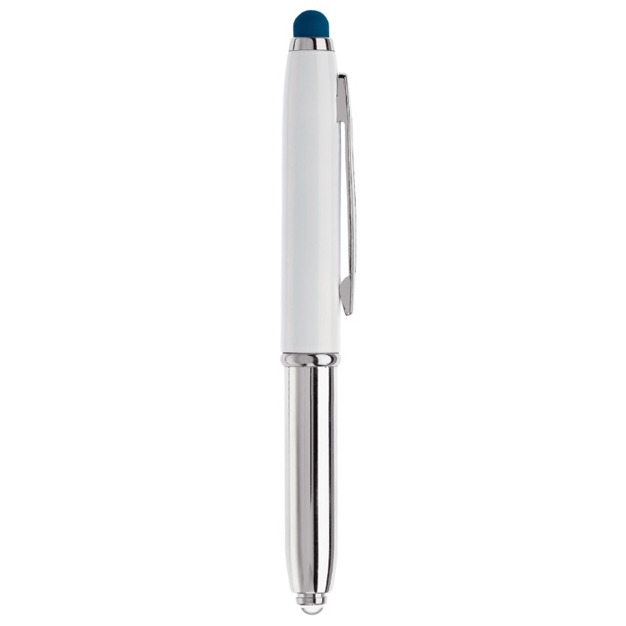 Touchscreen pen met lampje en balpen. Balpen te gebruiken door dop eraf te halen. Blauwschrijvend.