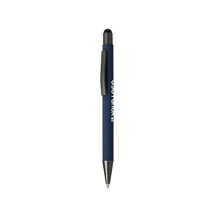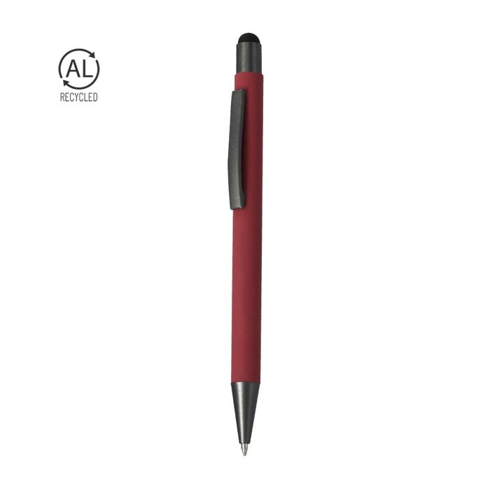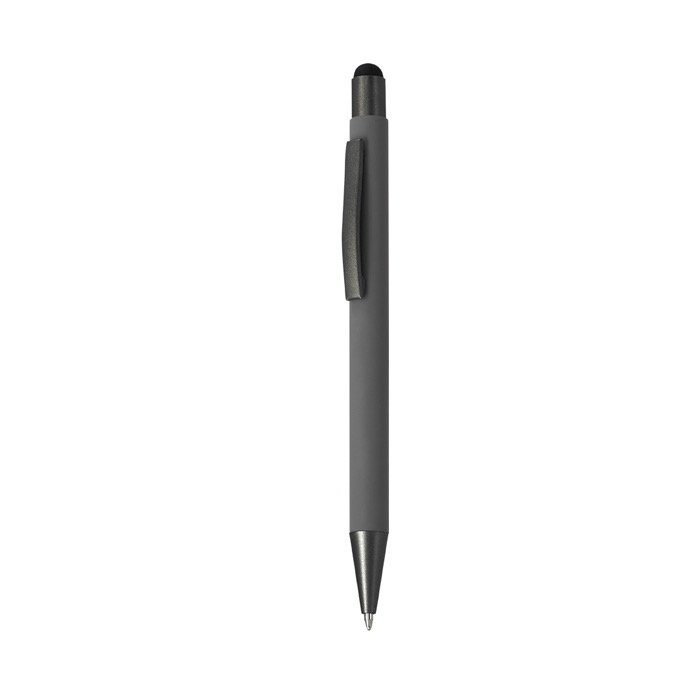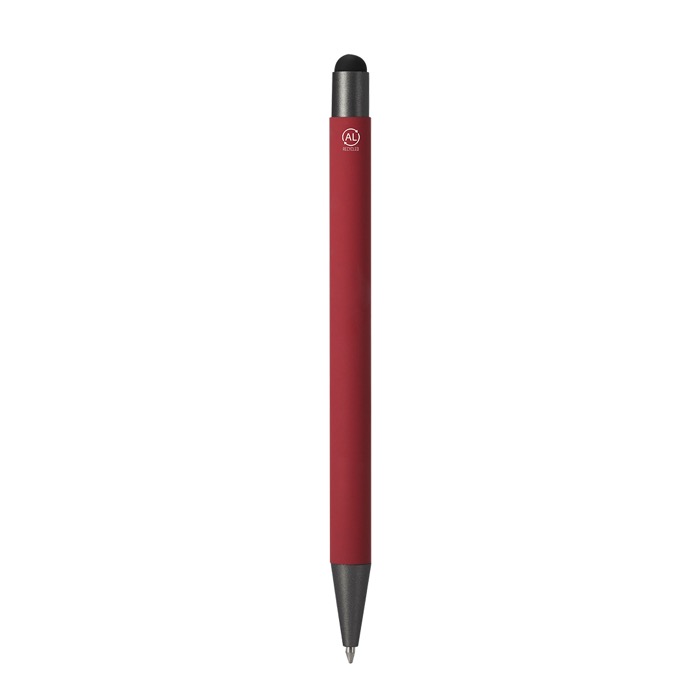 Styluspen van gerecycled aluminium met drukmechanisme, bedoeld voor dagelijks gebruik op kantoor en bij evenementen. Hij heeft een metalen clip en drukknop met gun metal afwerking en een bijpassende stylus voor touchscreens. De behuizing heeft een rubberen afwerking die de grip verbetert en lasermarkering makkelijker maakt, met een strak en goed leesbaar resultaat. Inclusief een kenmerk van gerecycled aluminium aan de bovenkant. Werkt met een jumbo-vulling en schrijft met blauwe inkt, handig voor brandingacties en beurzen.