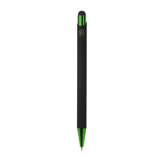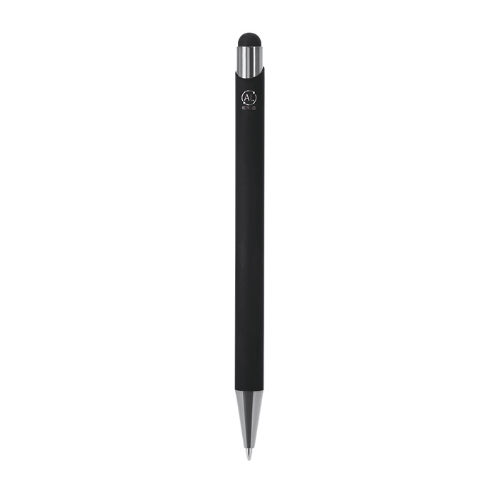 Aluminium pen met stylus van gerecycled aluminium met drukmechanisme, bedoeld voor dagelijks gebruik op kantoor en bij events. Met drukknop, metalen clip en een punt met glanzende afwerking voor een verzorgde uitstraling tijdens meetings. De body met rubberen afwerking is ontworpen voor lasergraveren en geeft een spiegeleffect waardoor het logo extra opvalt. Inclusief kenmerk van gerecycled aluminium aan de bovenkant. Gebruikt een jumbo-vulling en schrijft met blauwe inkt, handig voor handtekeningen en snelle notities bij de receptie of op beurzen.