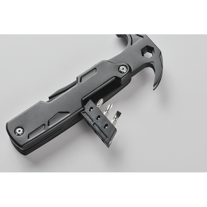14-in-1 multitool hamer van roestvrij staal met aluminium handgreep, ontworpen om meerdere gereedschappen bij de hand te hebben. Inclusief tang, schroevendraaiers, Engelse sleutels, mes, zaag en draadknipper voor veelzijdig gebruik. De flesopener maakt de set compleet. Compact en praktisch formaat om mee te nemen in voertuigen of onderhoudskits. Aanbevolen als relatiegeschenk voor beurzen, technische teams of welkomstacties.