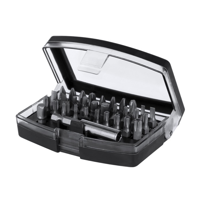 Gereedschapset met kunststof etui, bedoeld voor precisiewerk op kantoor, onderhoud en technische ondersteuning. Inclusief een adapter en 32 magnetische accessoires met verschillende bits: kruiskop, ster, plat, inbus en torx, voor het merendeel van de gebruikelijke schroeven in apparaten en kleine apparatuur. Het compacte formaat houdt het netjes en klaar in een lade of in je rugzak. Een goede keuze voor HR-acties, beurzen of bedrijfsmerchandise met jouw logo.