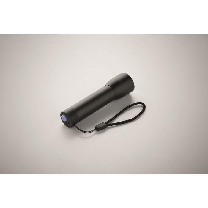 Oplaadbare zaklamp van gerecycled aluminium met meerdere lichtinstellingen en zoomfunctie om de lichtbundel aan elke situatie aan te passen. Voorzien van een vervangbare 14500-lithiumbatterij, ontworpen om de prestaties te behouden en vervanging mogelijk te maken wanneer nodig. De metalen behuizing biedt stevigheid bij dagelijks gebruik en het compacte formaat maakt het makkelijk om mee te nemen in rugzak, lade of voertuig. Praktische optie voor welkomstpakketten, interne uitrusting, beurzen of technische marketingacties.