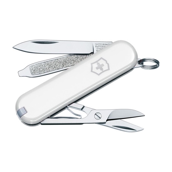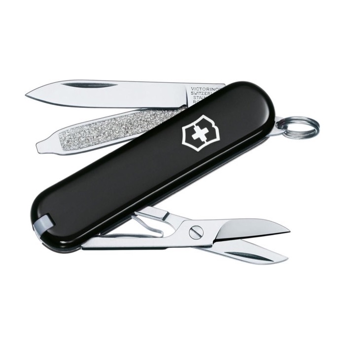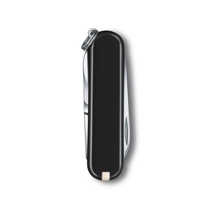 Victorinox zakmes met 7 functies: tandenstoker, schaar, pincet, vijl, schroevendraaier (2,5 mm), sleutelhanger en lemmet. Individueel gepresenteerd in een geschenkdoos.