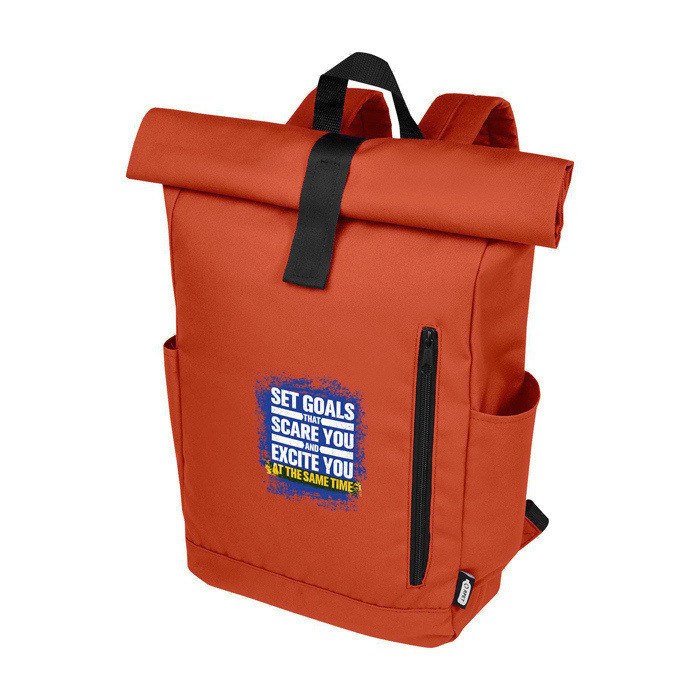 Laat je verleiden door de perfecte combinatie van comfort en duurzaamheid met deze populaire rolltop rugzak met logo! Dankzij het gerecycled polyester en voorzien van het GRS-label, draag je bij aan een betere wereld zonder in te leveren op functionaliteit. Deze rugzak biedt tal van voordelen, waaronder een speciaal compartiment voor laptops tot 16 inch. De rugzak is bovendien waterbestendig, waardoor je spullen optimaal beschermd worden. Extra functionaliteit wordt geboden door een centraal ritsvak, twee handige zijvakken, een gewatteerd rugpaneel voor extra draagcomfort, verstelbare en gewatteerde schouderbanden, en een praktisch draaghandvat. Het is dan ook geen verrassing dat dit product zich heeft gepositioneerd als een van de favorieten van onze klanten.