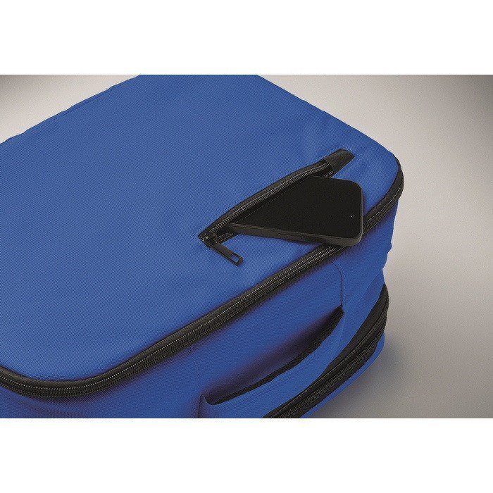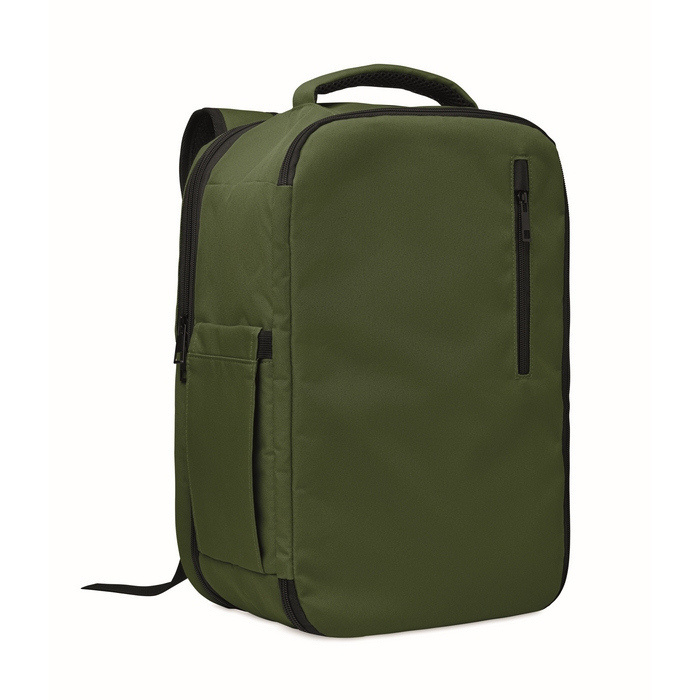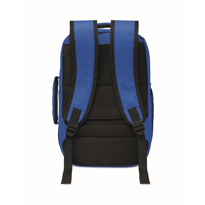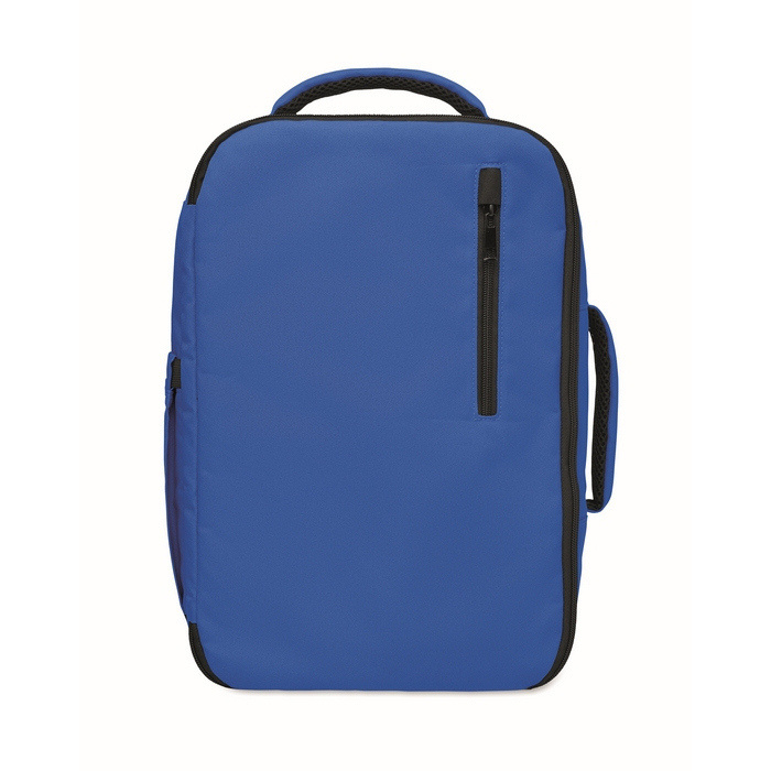 Cabinerugzak van RPET-polyester 600D, ontworpen voor zakenreizen en korte verplaatsingen. Voorzien van een opening van 180º om de inhoud snel te organiseren en overal bij te kunnen zonder hem leeg te maken. Het hoofdvak is verdeeld in twee open secties, met een mesh-scheiding om kleding en accessoires in het zicht te houden. Inclusief een gevoerd vak voor een laptop van 15 inch en een achterband om hem aan de trolley te bevestigen. Handig voor welkomstkits, evenementen en zakelijke reizen.