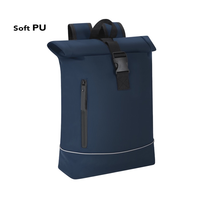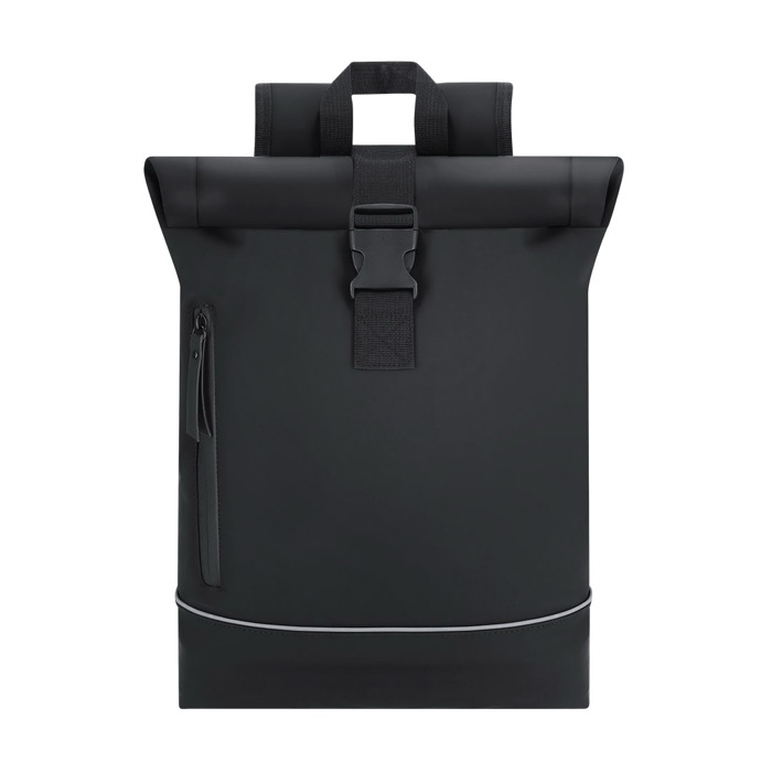 Rugzak van zacht en sterk kunstleer, bedoeld voor je dagelijkse ritten en zakenreizen. Met een reflecterende strip aan de voorkant voor betere zichtbaarheid en een oprolbare sluiting met rits en verstelbare gesp, zodat de inhoud goed beschermd blijft. Binnenin is er veel ruimte, inclusief een gewatteerd vak voor een laptop tot 15". Daarnaast heeft hij een waterbestendig voorvak, een gewatteerde achterkant en comfortabele schouderbanden. Met de band aan de achterkant zet je hem vast aan een trolley, handig voor evenementen, beurzen of mobiliteit binnen het bedrijf.
