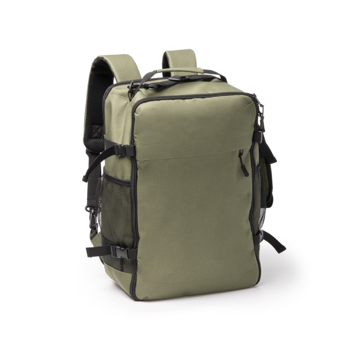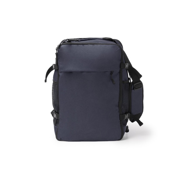 Reisrugzak van gerecycled 600D-kunststof met een 180°-opening zodat je snel bij de binnenkant kunt. Met een ruim hoofdvak en vakverdelers in meerdere formaten om kleding en accessoires netjes te ordenen, plus verstelbare zijgespen om de lading te stabiliseren. Voorop zit een ritsvak voor spullen die je vaak gebruikt en achterin een gewatteerd compartiment voor documenten of je laptop met extra bescherming. Met mesh zijvakken voor flessen, een anti-diefstalvak en een trolleyband. Een praktische keuze voor zakelijke reizen en merkacties.