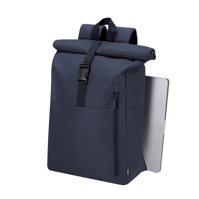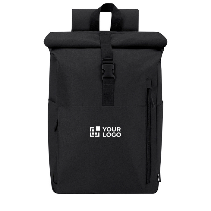 Rugzak van stevig 300D RPET met rolsluiting en gesp. Voorzien van twee voorvakken, een achtervak met zij-ingang en twee extra zijvakken. Ruim interieur met gevoerd vak voor laptops tot 15 inch. Gewatteerde schouderbanden en rug. Inclusief bagageriem voor bevestiging aan trolley of koffer, ideaal voor reizen en woon-werkverkeer. RPET-materiaal wordt gemaakt van gerecycled plastic, waardoor het hergebruik van plastic afval wordt gestimuleerd en bijgedragen wordt aan de duurzaamheid van de planeet.