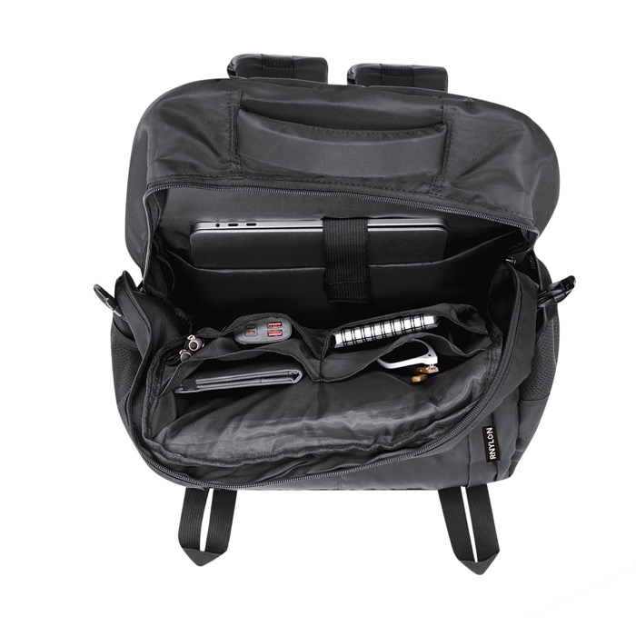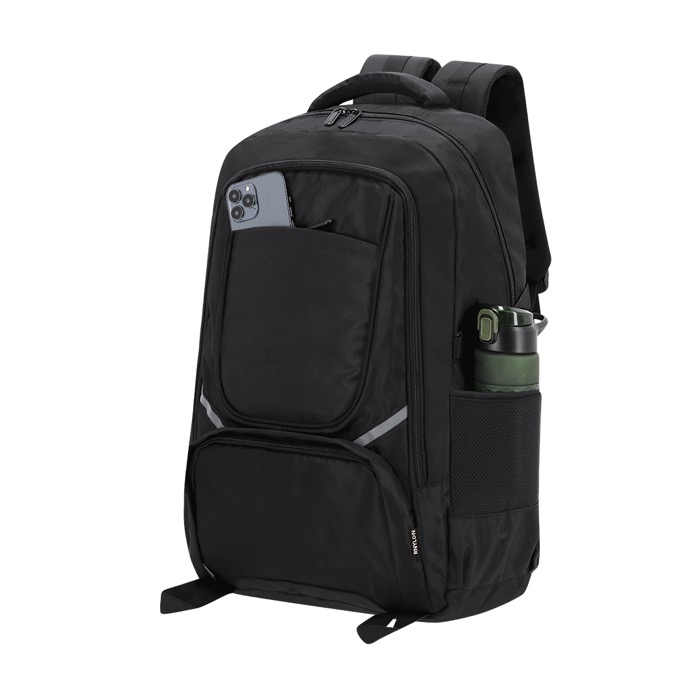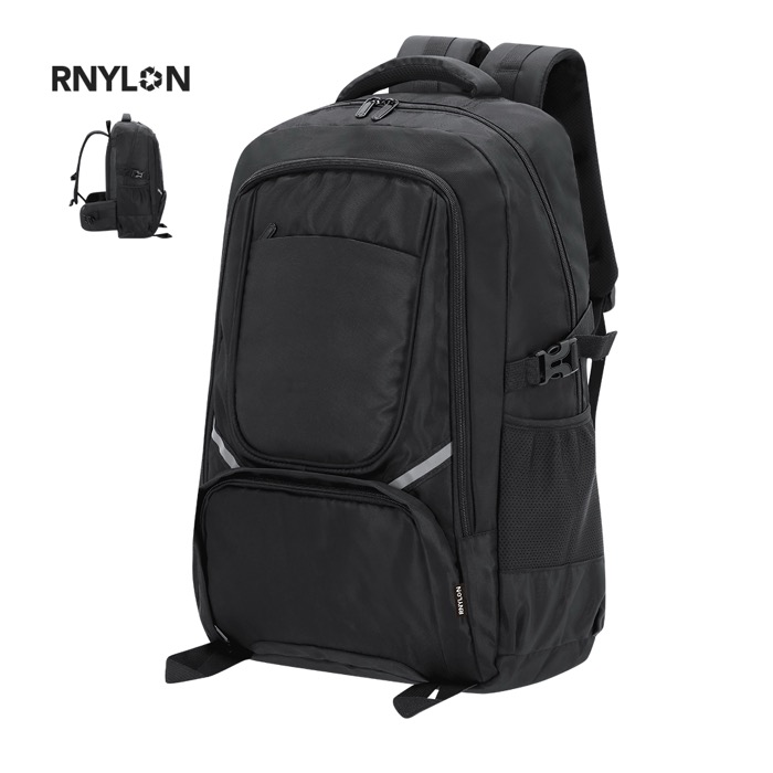 Rugzak van gerecycled 420D nylon voor elke dag, op werk en onderweg. Hij heeft een hoofdvak met rits en dubbele ritstrekker, plus twee voorvakken met rits om accessoires te organiseren. Inclusief zijvakken van mesh en verstelbare banden met gesp voor extra stevigheid. Binnenin zit een laptopvak voor laptops tot 15''. De rug en verstelbare schouderbanden zijn gevoerd, met borstsluiting voor stabieler dragen. Handig voor events, salesteams en onboarding.
