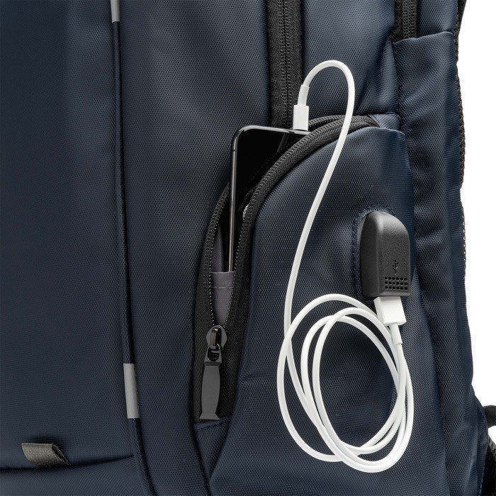 Nylon rugzak met een gewatteerd binnenvak voor een laptop. Voorzien van gewatteerde schouderbanden en rugpaneel. Het hoofdvak heeft een USB-uitgang en wordt geleverd met een micro-USB-kabel (powerbank niet inbegrepen). Ideaal voor dagelijks gebruik of op reis.