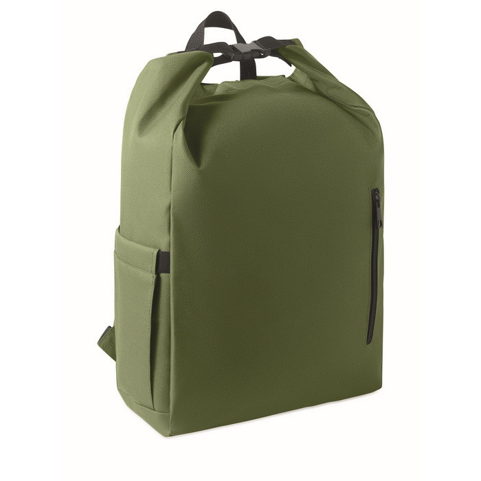 Roll-top rugzak van RPET 600D polyester met gevoerde RPET 210D voering, ontworpen voor het vervoeren van een laptop tot 15 inch en werkaccessoires. Inclusief een voorvak met rits om kabels, oplader of documenten te organiseren, plus een elastisch zijvak voor een fles of paraplu. De verstelbare schouderbanden zorgen voor een comfortabele pasvorm tijdens dagelijkse verplaatsingen. Een praktische optie voor interne uitrusting, welkomstpakketten of corporate merchandisingacties.
