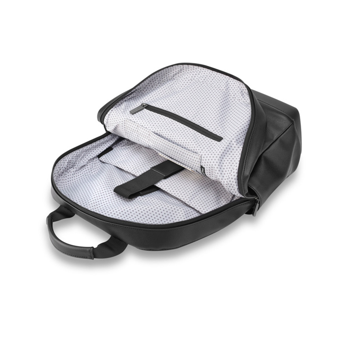 Stedelijke rugzak van technisch textiel, gemaakt voor het dagelijkse tempo en onderweg. Hij heeft twee hoofdvakken, waarvan één geschikt is voor een laptop tot 15'' zodat je je spullen beter beschermd en overzichtelijk meeneemt. De achterkant met ademend mesh verhoogt het comfort tijdens langere trajecten. Met een voorvak met thermisch gesealde sluiting en een band om hem aan je bagage te bevestigen. Binnenin zitten een organizer, pennenhouder en kaarthouder. Een praktische keuze voor onboarding, conventies en merkacties in mobiel gebruik.