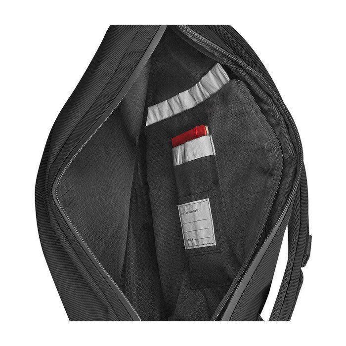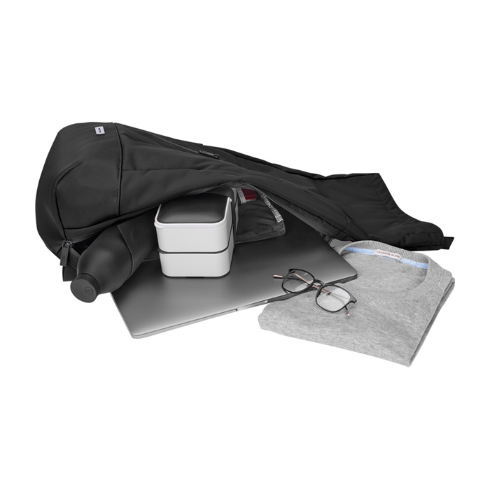De roll-top rugzak “Metro” heeft een moderne, urban look. Hij heeft een compartiment met roll-top sluiting, een zijvak met rits voor snelle toegang en ademende mesh op de achterkant voor extra comfort en frisse ventilatie. Verder heeft hij een voorvak, een bagageriem voor langere trips, een noodfluitje, gevoerde schouderbanden en een open, plat buitenvak. Binnenin zitten twee veilige vakken met rits en een notitievak om ideeën in te bewaren. Je kunt er ook veilig een elektronisch apparaat tot 15” in meenemen.