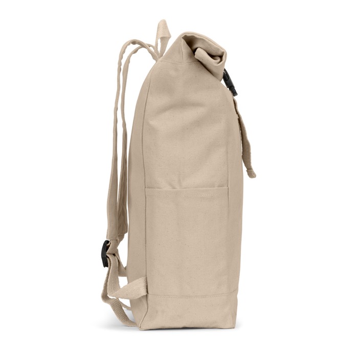Rolltop-rugzak van gerecycled katoen en gerecycled polyester van 380 g/m², ontworpen voor comfortabel en overzichtelijk dagelijks gebruik. Hij heeft 1 hoofdvak voor documenten, laptop of werkmateriaal en een oprolbare bovensluiting waarmee u het volume kunt aanpassen. Er is 1 voorvak met rits voor spullen die u snel nodig heeft en 2 zijvakken voor een fles of accessoires. Een praktische optie voor welkomstpakketten, interne events of merkacties onderweg.