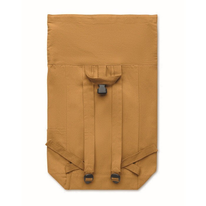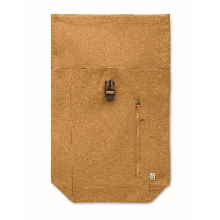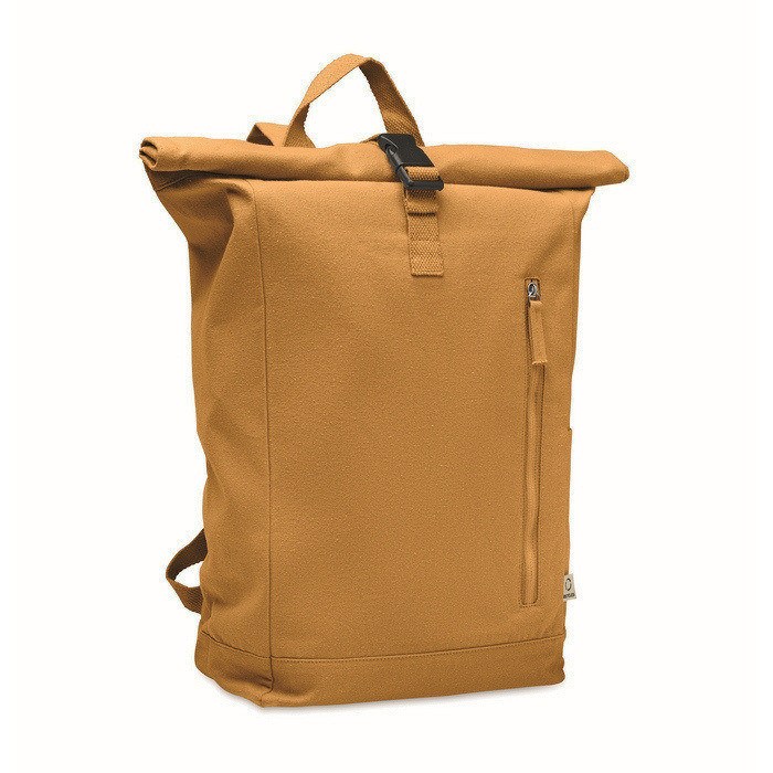 Rolltop rugzak van gerecycled katoen. Voorvak met ritssluiting. Praktisch en duurzaam, perfect voor personalisatie en gebruik op bedrijfsevenementen.
