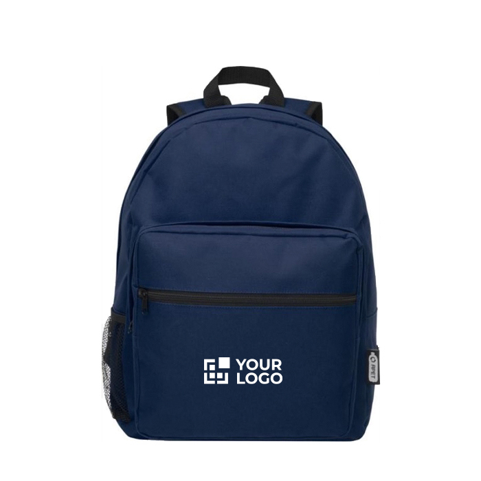 Ecologische laptop rugzak met logo, gemaakt van 100% gerecycled plastic. Met 2 vakken, verstelbare schouderbanden en ritsen.