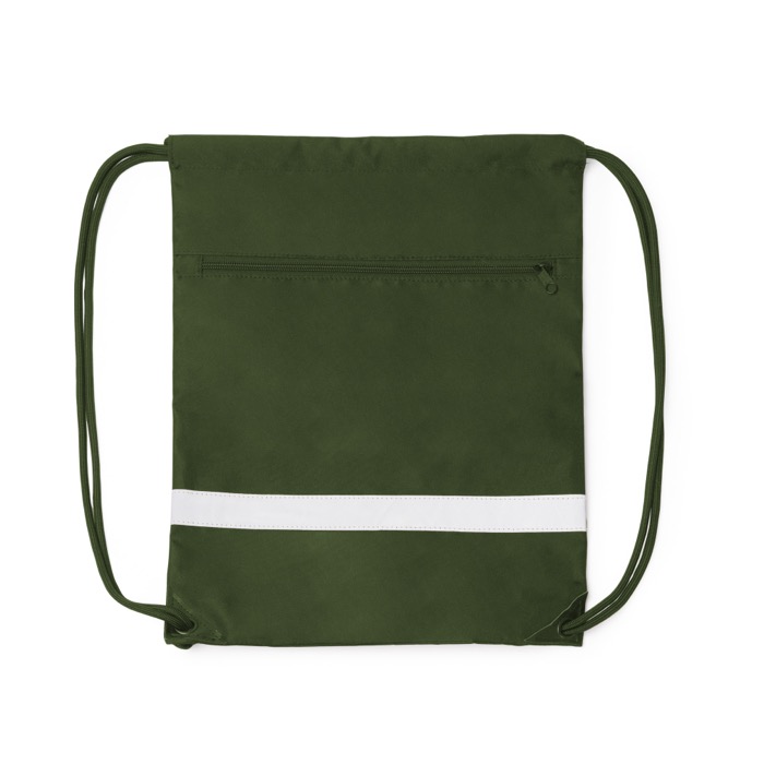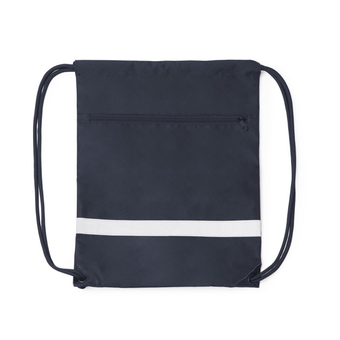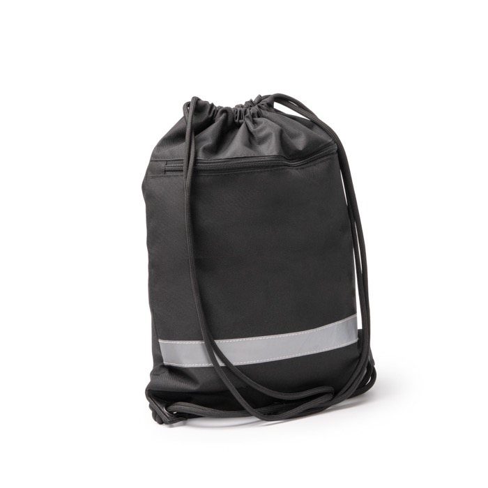 Rugzak van gerecycled 300D-plastic met verstelbare trekkoorden. Je draagt hem comfortabel over de schouder of als zak. Hij heeft een voorvak met ritssluiting, handig voor sleutels, badge of mobiel, en een horizontale reflecterende band voor betere zichtbaarheid onderweg. De verstevigde hoeken van synthetisch leer helpen de levensduur te verlengen bij dagelijks gebruik. Een praktische optie om teams uit te rusten, voor wervingsacties of als giveaway op beurzen en bedrijfsevenementen.