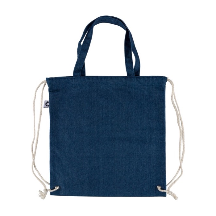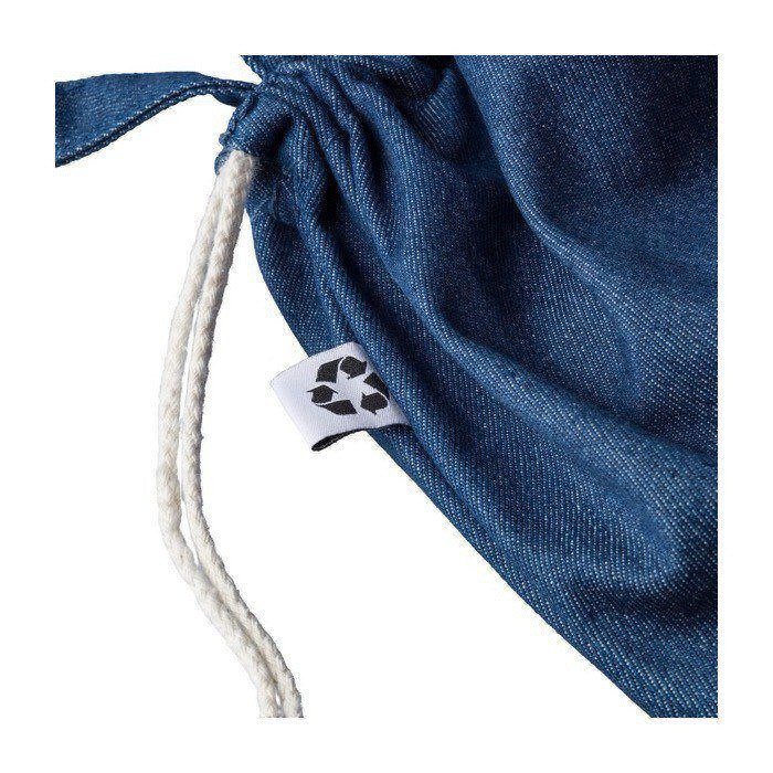 Rugzaktas van gerecycled denim met koordsluiting, bedoeld voor dagelijks gebruik op beurzen en bij merkacties. Ruim formaat van 40 x 38 cm. Met lange handgrepen van 2,5 x 50 cm. Je draagt hem met de schouderkoorden of in de hand. Inclusief buitenlabel voor recycling. Geleverd zonder individuele verpakking. Een praktische optie voor events, winkels en campagnes met logo.