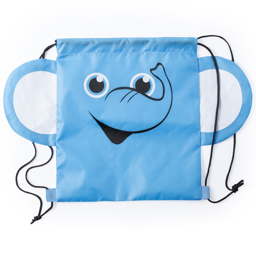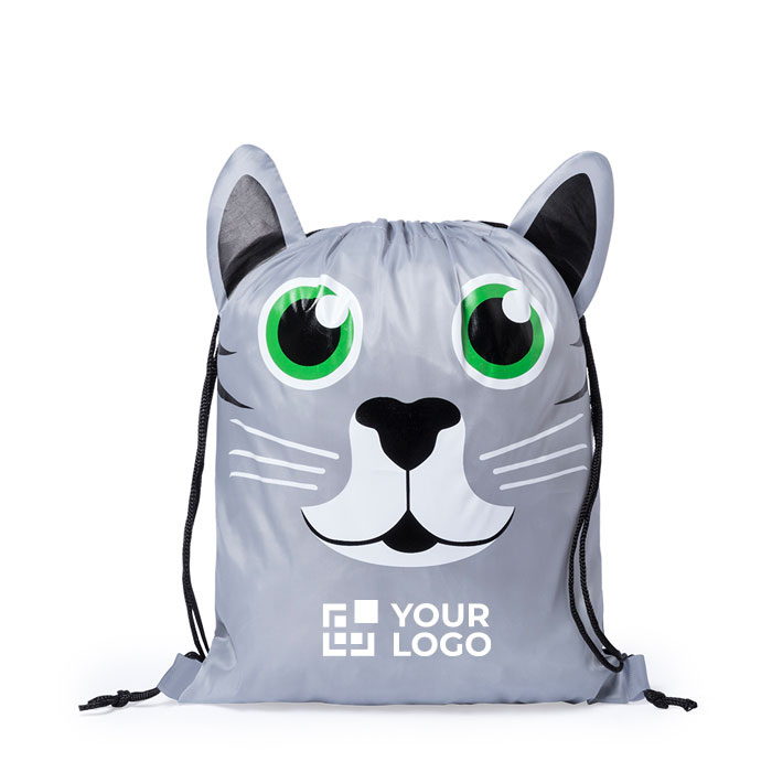 Bedrukte rugzak met trekkoord voor kinderen, gemaakt van zacht polyester 210T met originele dierenmotieven. Met zwarte zelfsluitende snaren en versterkte hoeken. Klein vouwformaat.