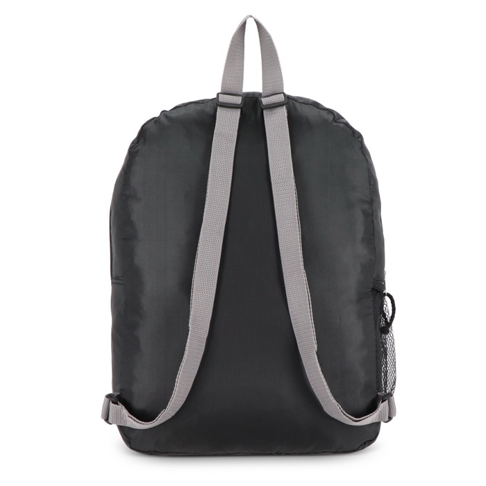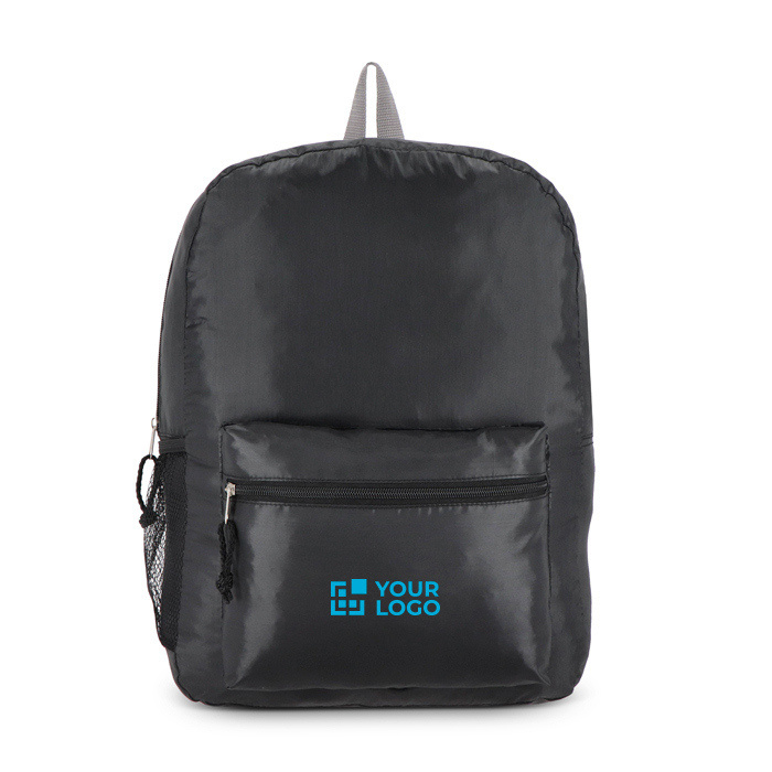 Rugzak van gerecycled 190T-plastic, bedoeld om je te vergezellen tijdens verplaatsingen en korte uitstapjes met weinig gewicht. Met een voorvak met rits voor sleutels, portemonnee of badges, plus verstelbare schouderbanden zodat hij bij verschillende gebruikers past. Het zijvak van mesh houdt een fles of paraplu binnen handbereik. Je vouwt hem op tot een heel klein pakket, handig om mee te nemen in je bagage of in een lade. Een praktische keuze voor merkacties tijdens bedrijfsreizen en events.