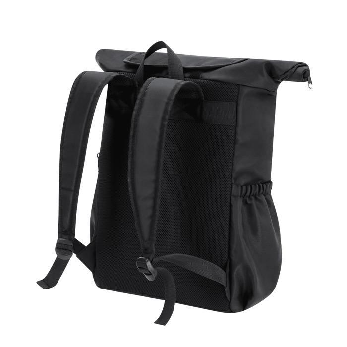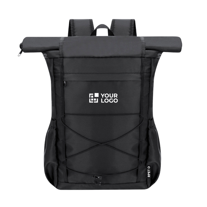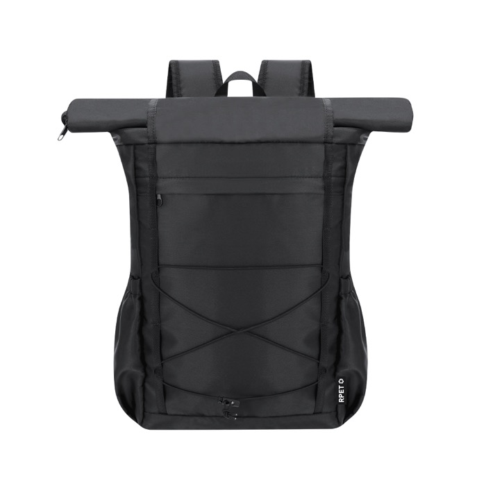 Rugzak van gerecycled 290D polyester met rolltopsluiting, rits en een tweede klittenbandsluiting om de inhoud goed vast te zetten. Met een voorvak met verborgen rits en een verstelbaar elastisch koord om een jas of accessoires vast te maken. Er zijn ook twee zijvakken voor flessen of spullen die je snel wilt pakken. Binnenin is er veel ruimte en een gewatteerd vak voor een laptop tot 15 inch. De rug en schouderbanden zijn gewatteerd voor dagelijks gebruik. Aan te raden voor welkomstacties, beurzen of een intern team met logo.