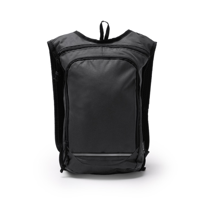 Rugzak van gerecycled 600D-kunststof voor dagelijks gebruik op het werk, bij events of onderweg. Hij heeft een hoofdvak met rits aan de bovenkant en twee openingen voor drinkslangen, handig voor buitenactiviteiten of routes. Aan de voorkant zit een grote buitenzak met rits om documenten en accessoires te organiseren. De zwarte ritstrekkers zorgen voor een strakke, uniforme afwerking. Met horizontale reflecterende band voor betere zichtbaarheid, plus gewatteerde schouderbanden en rug. Een praktische optie voor merkacties en teamuitrusting.