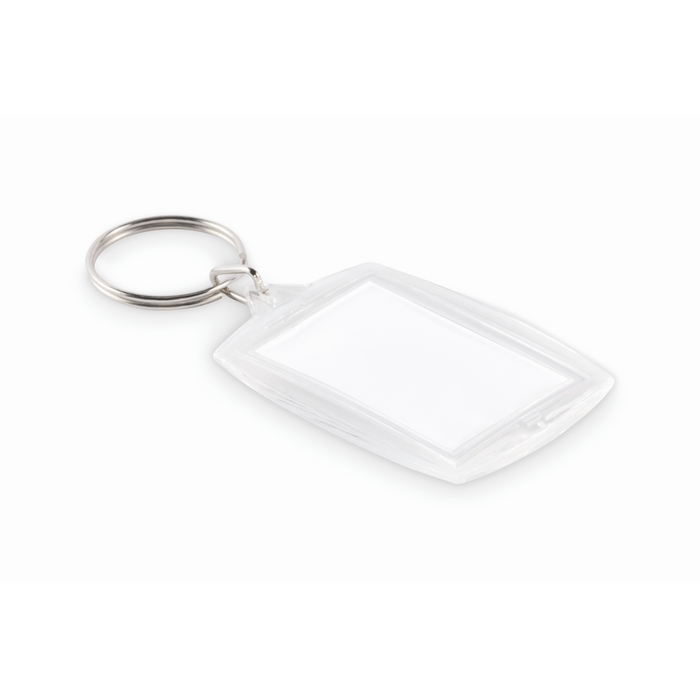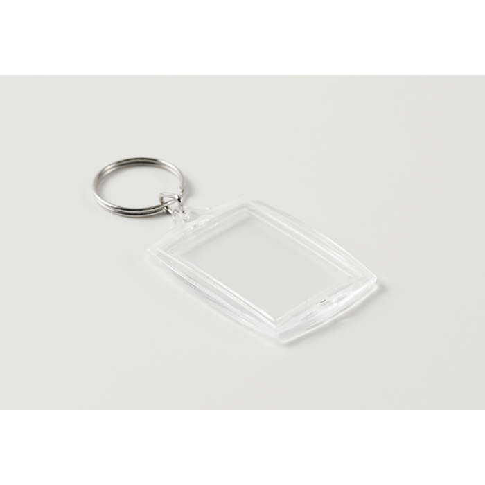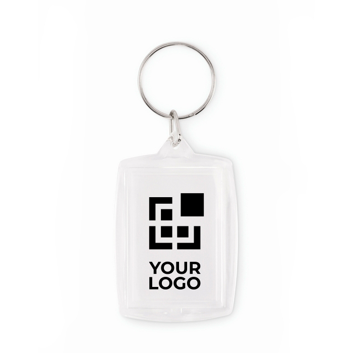 Klassieke acryl sleutelhanger met ruimte voor een full-colour papieren inzet, bedoeld om een afbeelding, logo of bedrijfsboodschap toe te voegen. Voorzien van een binnenvenster voor een foto van 4,1 x 2,7 cm, waardoor standaardontwerpen eenvoudig zijn voor te bereiden en indien nodig te vervangen. Het formaat is licht en comfortabel om te dragen aan sleutels, badges of rugzakken en biedt een zeer zichtbare personalisatie. Aanbevolen voor merkcampagnes, evenementen, onboarding van medewerkers of loyaliteitsacties.