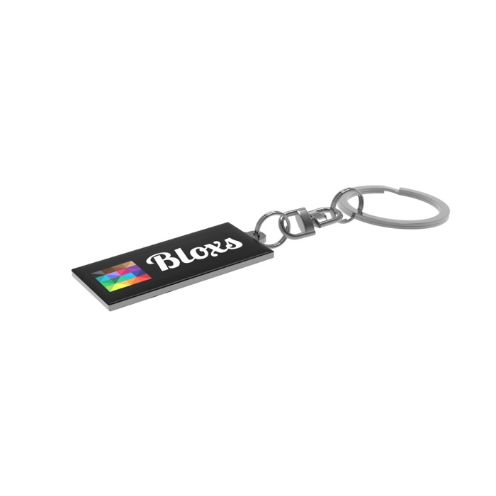 Rechthoekige metalen sleutelhanger met full colour bedrukking aan beide zijden, waardoor je merk dagelijks zichtbaar is voor klanten en medewerkers.